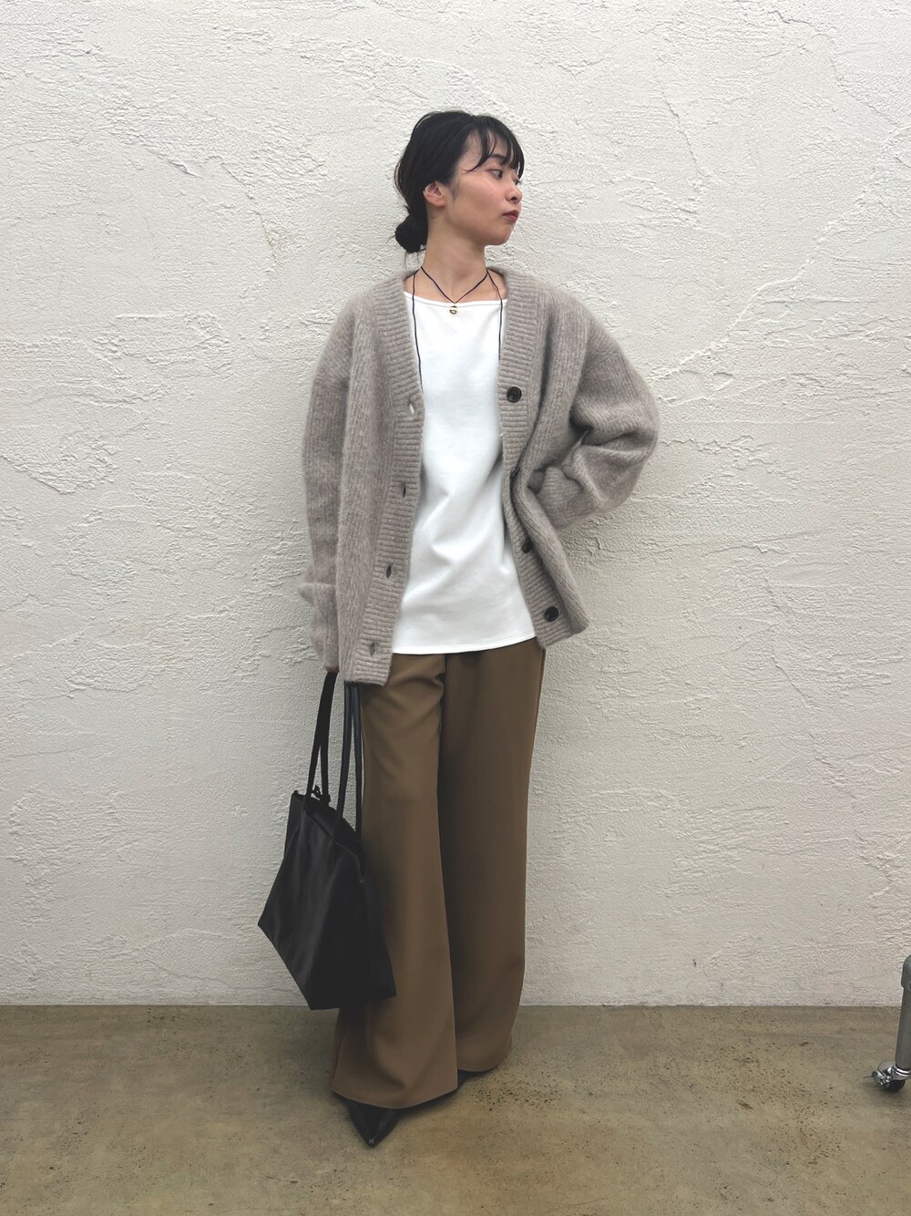 半袖のポンチプルオーバーにファーカーデを羽織って調節! トレンドのブラウンコーデ🤎 155cmで低くも高くもない絶妙な身長なのでボリュームのあるニットを着る時はスッキリボトムを。 今回はフレアパンツをチョイスしました!