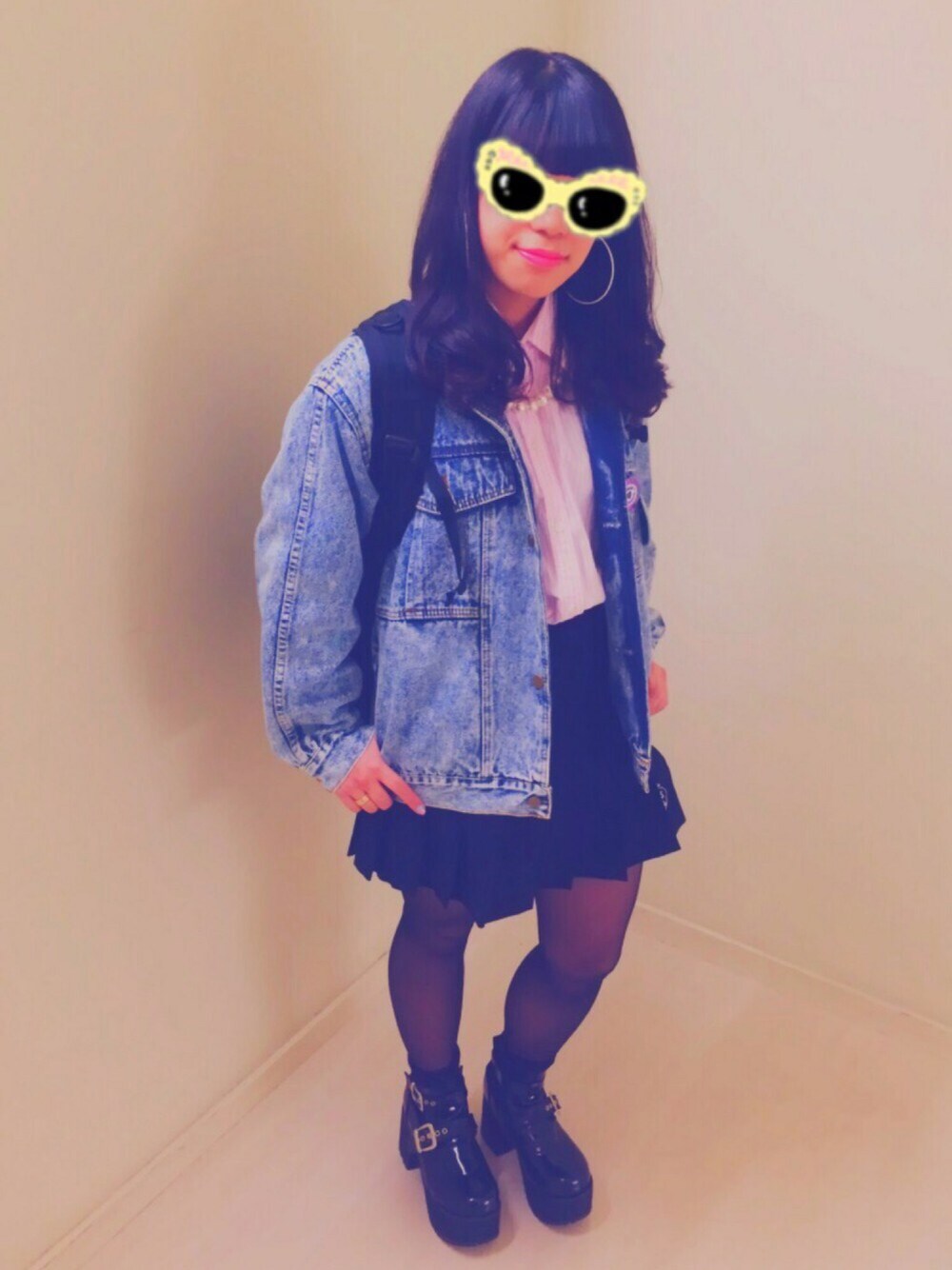 2016.3/14 久しぶりに古着多めコーデ🐰 usedのパステルピンクのストライプカッターシャツにはトイプードルのワッペンがいっぱいついてます🐩💓 ピアス、スカート、厚底ブーツはBUBBLESです💒