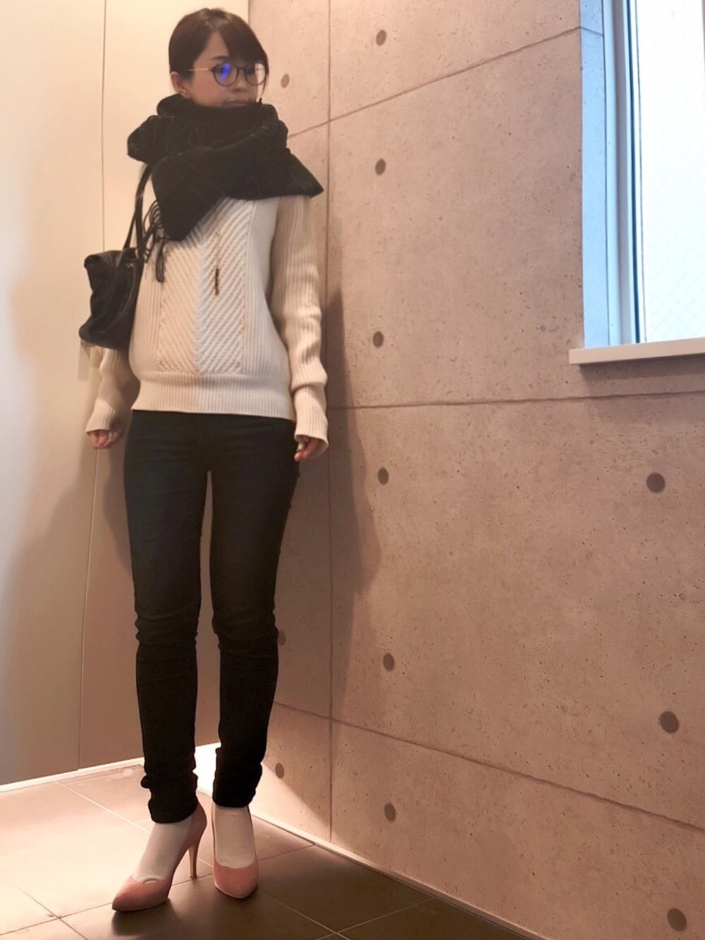 デニムだとカジュアルすぎるので、白靴下とハイヒールであわせてみました。リベラシオンの9センチヒールは背筋がピッとなります! ちなみにこの白靴下は、以前行ってたジムで、靴下忘れた時にその場で買ったものです…笑 ゾフのウェリントンは、度無しブルーライトカットレンズなので、お仕事のときよくかけています🌞
