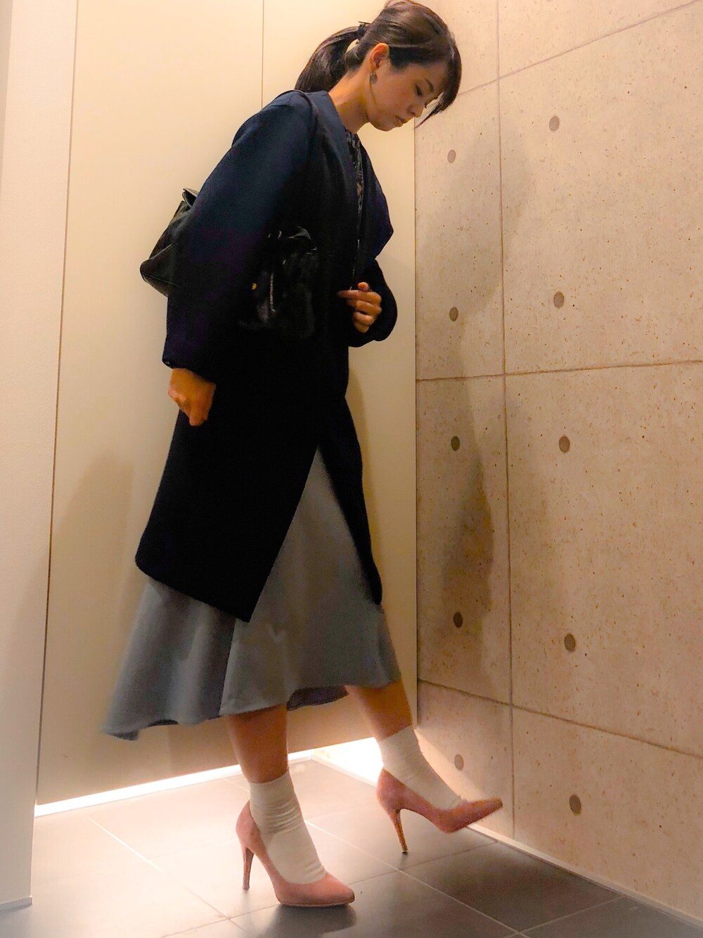 アウターがネイビー、カットソーは花柄のネイビー、スカートがライトブルーのブルーコーデなので、ヒールはピンクに。 靴下の白でつなげて、馴染ませました。 白ソックスとあわせるとカジュアルダウンにもなります。