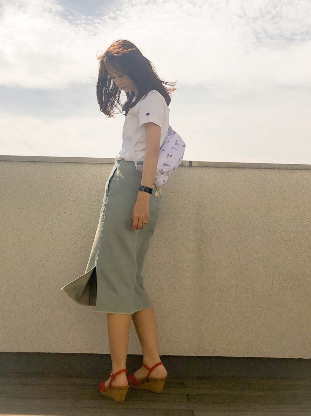デニムスカートと白Tシャツでシンプルに。GUのバックパックで両手も空くので、動きやすくて好きなスタイルです。 あと、犬が乱入しました。笑