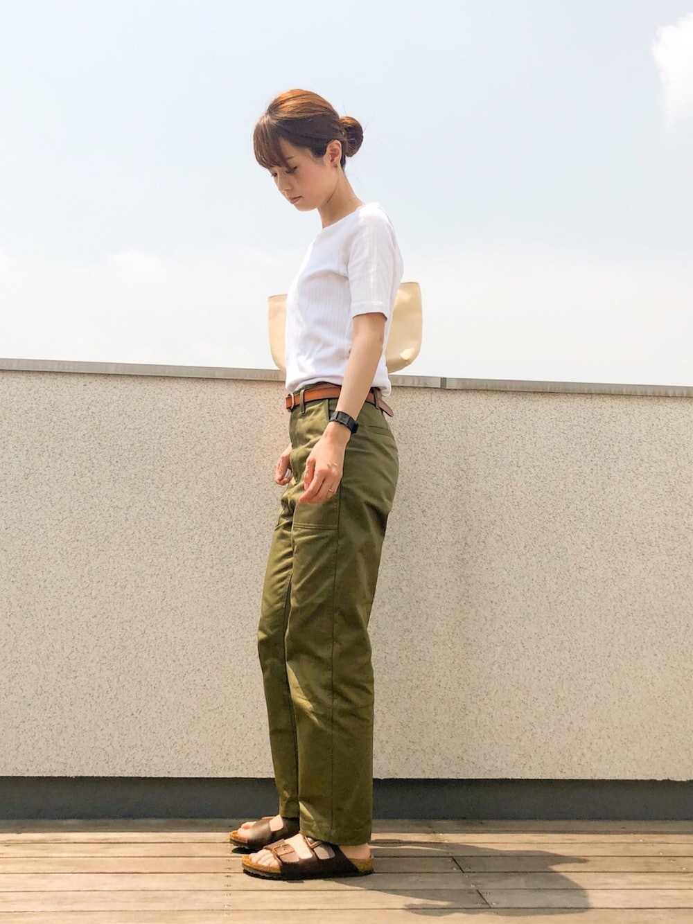おはようございます😃 お休みだったのでサンダルにパンツでリラックスコーデ。ビルケンはかれこれ3年くらい使っているのですが、ヘタる気がしません。笑 暑くて首回りをスッキリしたかったので髪は一つにまとめました☺️