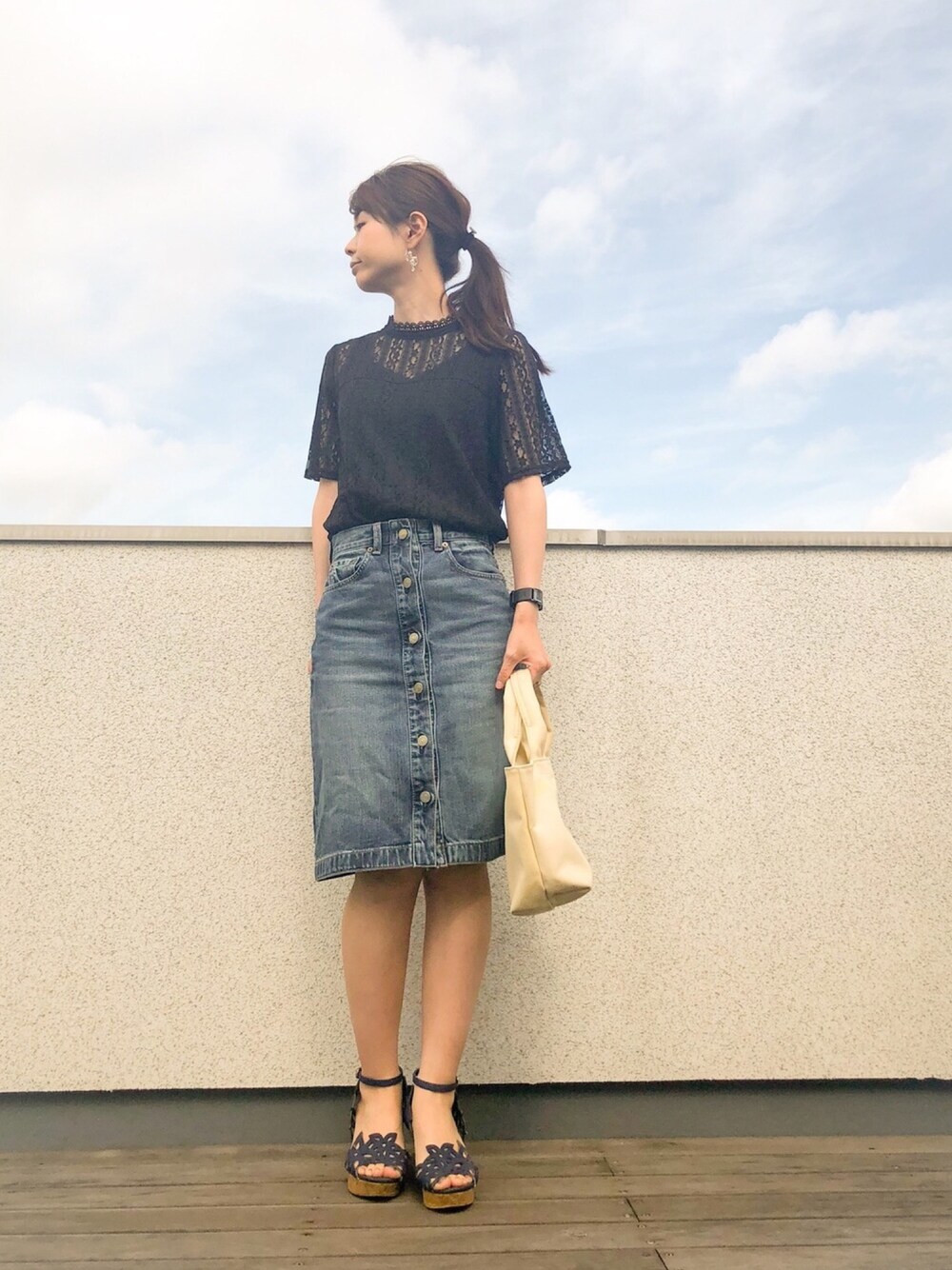 ガーリーなトップスなので、カジュアルなデニムスカートをあわせました。GUのデニスカはKJコラボのものですが、色落ち感が気に入っています☺️