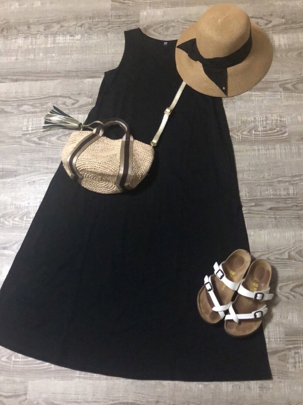 シンプル黒ロングワンピでバカンスコーデ