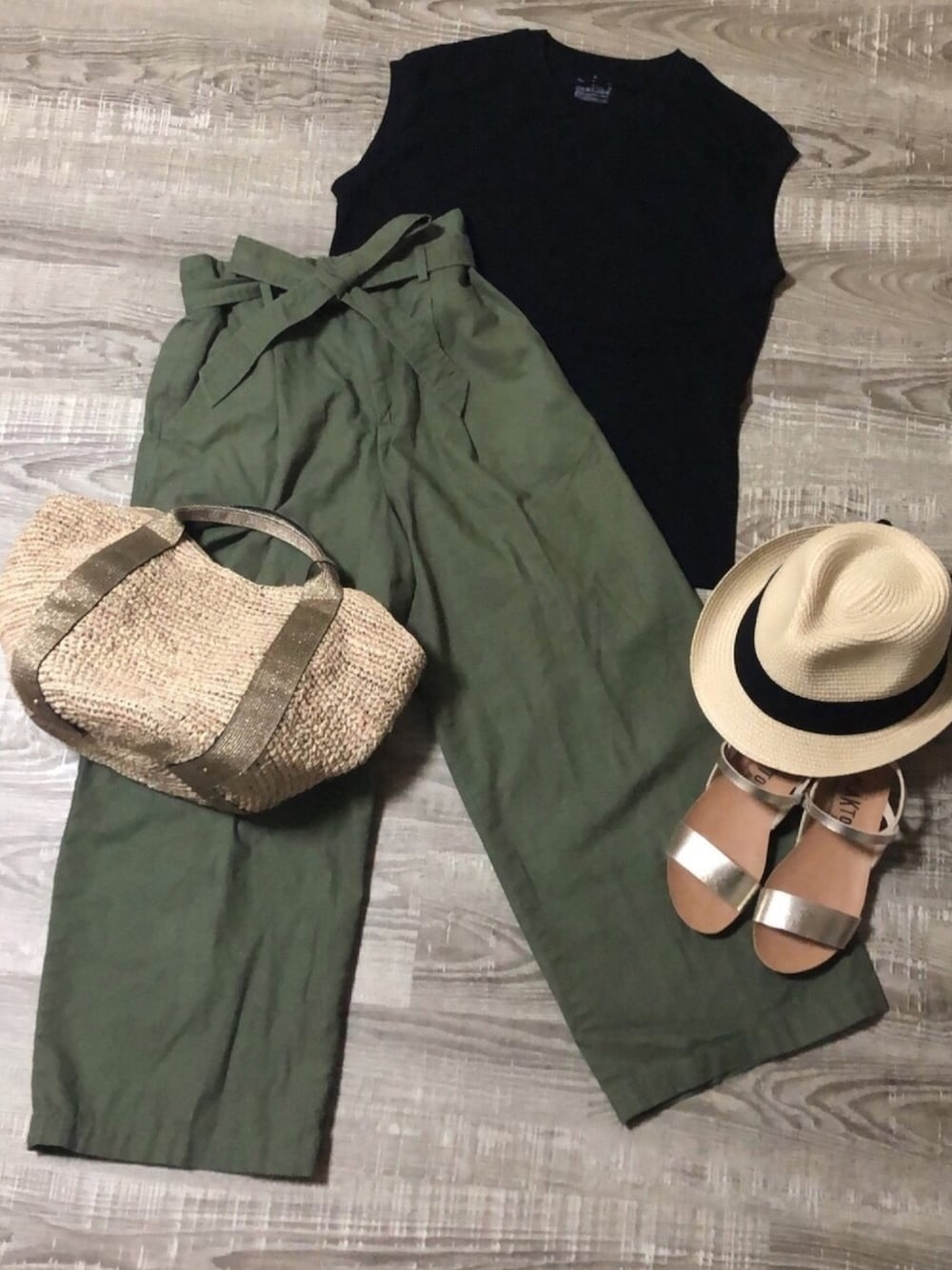 大活躍の無印スリーブレスT👍 フレンチスリーブTよりも袖の感じ、生地感、首の空き具合、こちらの方が好みでした🙃 今日はUNIQLOワイドパンツで♡ 昨年のものです😙