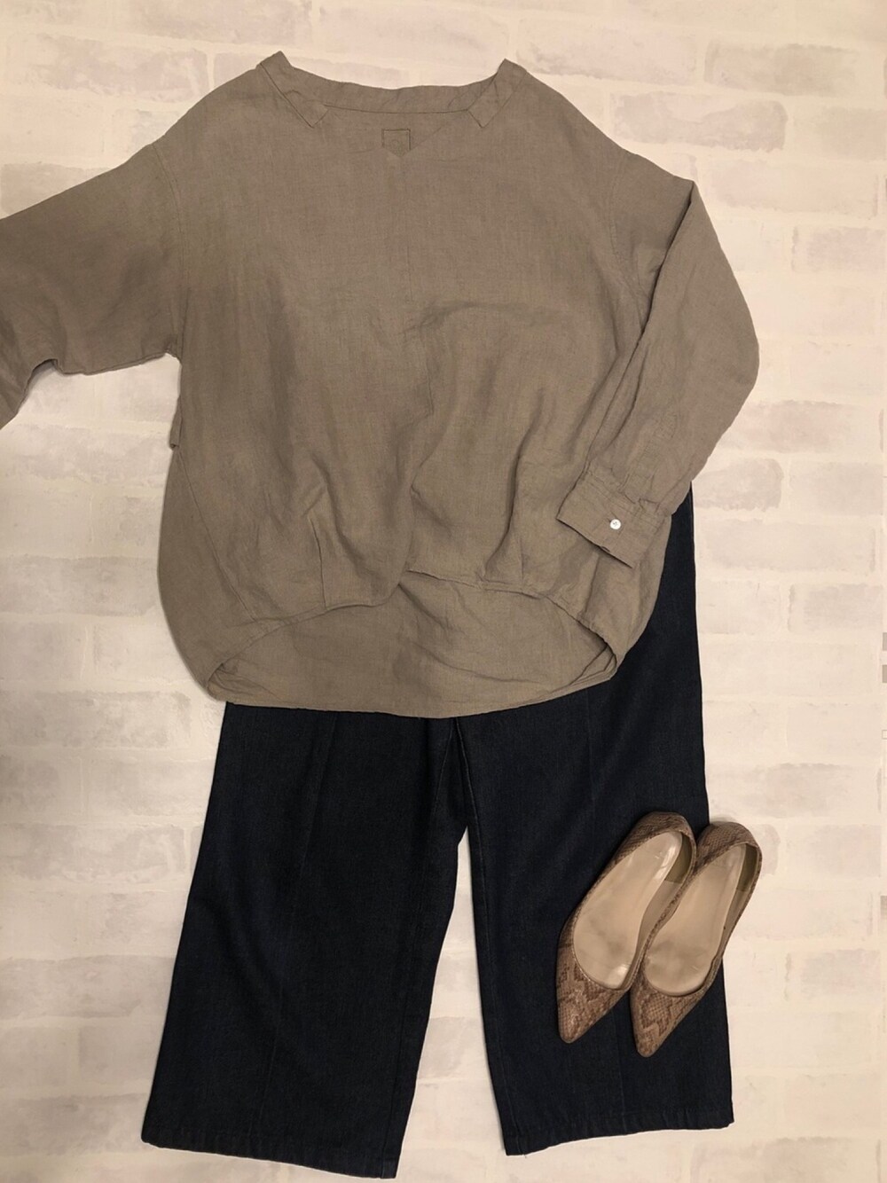 数日前のコーデ そろそろ涼しくなるのかと思いきや、まだまだ暑い🤣 長袖ですが、リネンで少し涼しげに😉実際、肌にまとわりつかない感じが涼しい気がする🤔 センタープレスのデニムワイドパンツもお気に入りです!