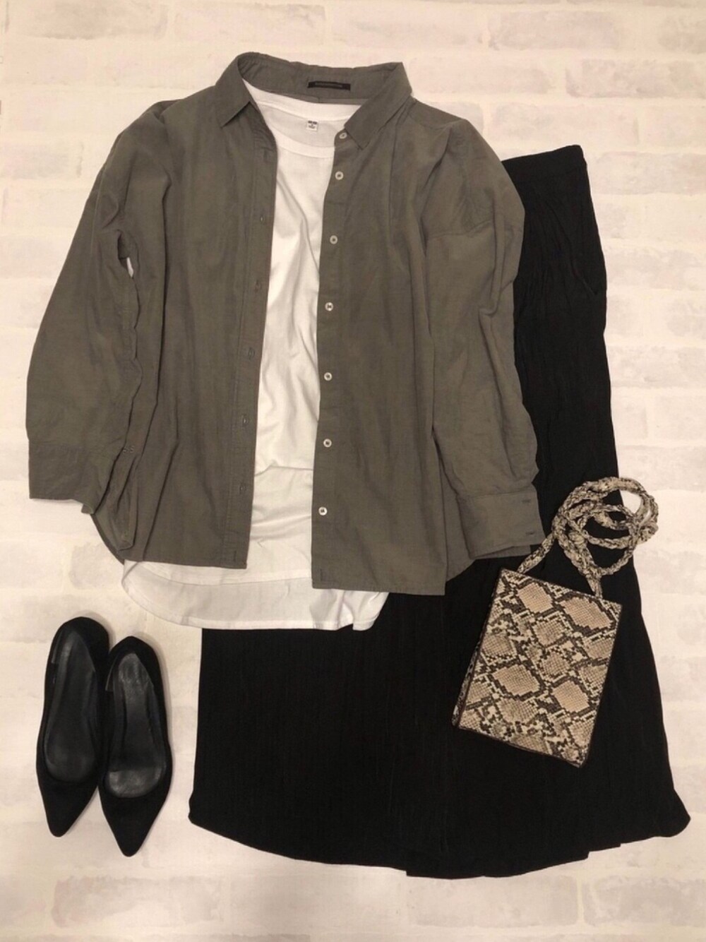 昨日のコーデ♡ カーキの細コールシャツ×ワッシャーサテンスカートパンツ ゴーデュロイ素材、大好きだけど、私が着るとどうしても子供っぽく見えてしまう😵 でも、このシャツは細コールで、きれい目にも使えるから愛用してます👍✨