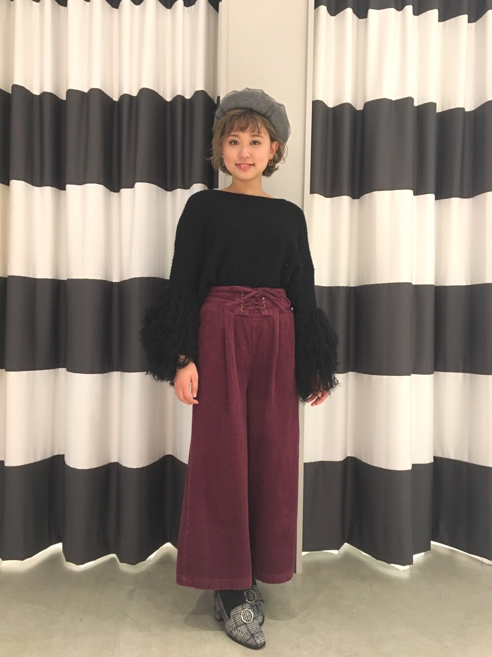 まず!ベレー帽!!チュール付きでめっちゃ可愛い♡♡ 形も崩れにくくなっててめっちゃ被りやすかった💓💓 トップス→袖のボリューム感たっぷりなファーがポイントのニット♡デコルテみせで小顔効果も◎ 今年のトレンド満載のアイテム(*ˊ˘ˋ*)。♪:*° ボトム→ゴーディロイのハイウエストパンツ!ゴーディロイ×ボルドーで冬感にあたたかみもプラスされるから、いい感じ~✩ 脚長効果にも◎ 靴→ヒール付きのパンプス!チェックグレーで大人っぽい!!!これもオススメだよーん(⸝⸝⸝ᵒ̴̶̷ ⌑ ᵒ̴̶̷⸝⸝⸝)✨