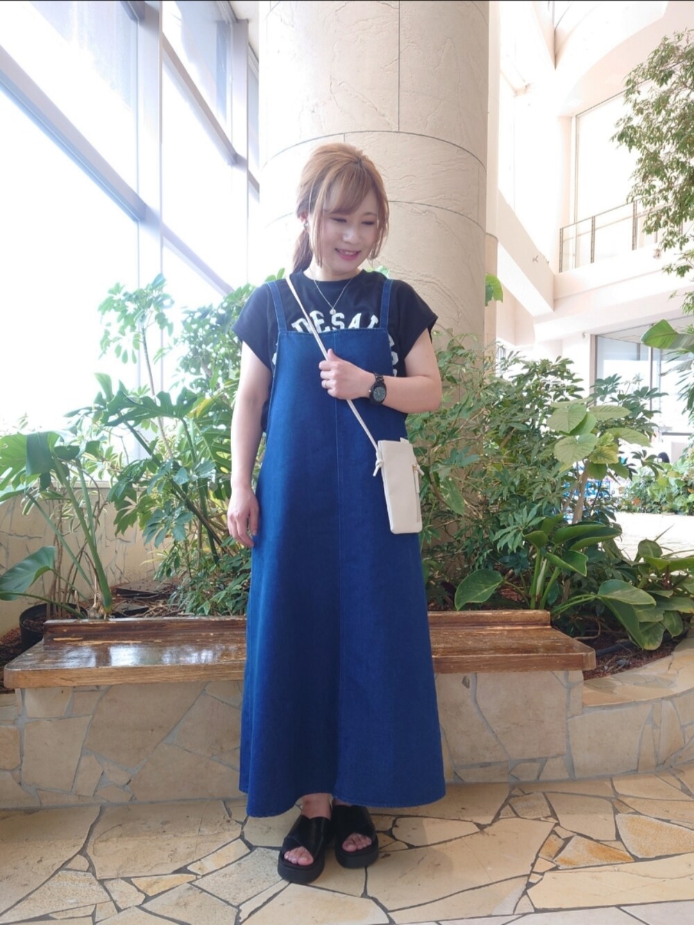 ご覧いただきありがとうございます✨ 休日カジュアルコーデ💗 アーチを描くロゴプリントがポイントのTシャツ デニムサロペットを合わせてカジュアルな着こなしに