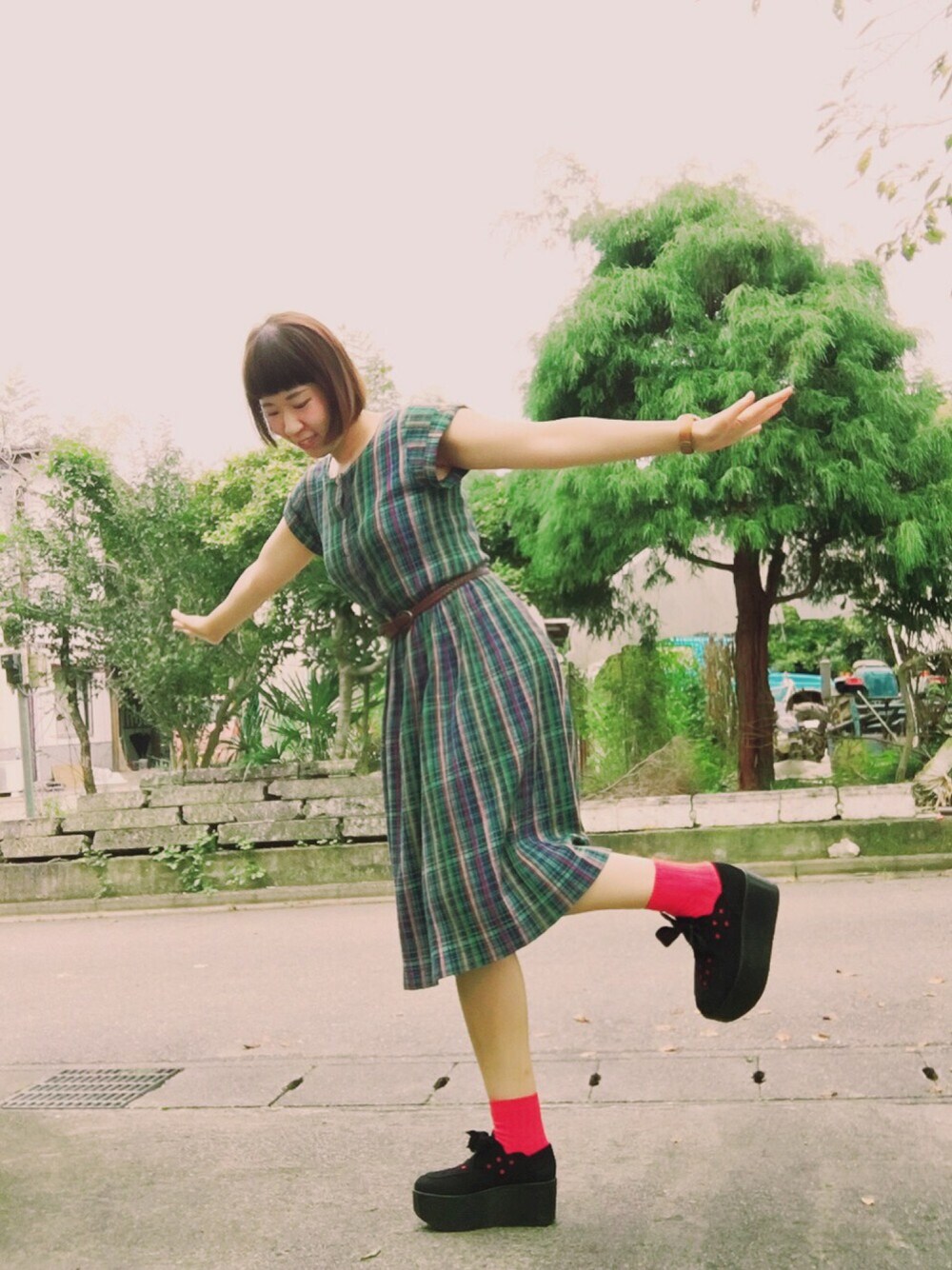 ワンピース👗で楽チンコーデ😛 グリーンのチェックが可愛い😍💕 足元はbopperで決まり❣️