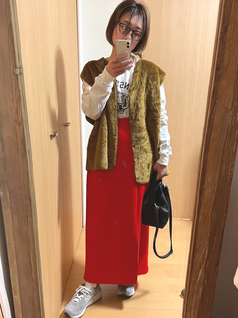 GILDANカレッジロゴオーバーサイズロンT🐯 ファーベストとレッドのスカートと👌 何にでも合うからほんとにオススメです〜! 今ならzozoでタイムセールやってまーす!
