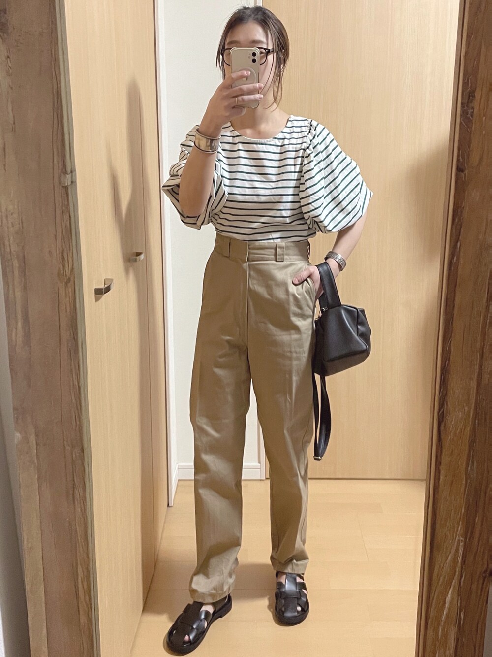 いつも見ていただきありがとうございます😊 いいね、お気に入り、フォローとても嬉しいです✨ ぽわん袖がかわいい ANGIEのパフスリーブのボーダーT🍀 メンズライクなハイウエストチノパンにグルカサンダルを合わせたカジュアルコーデにしてみました🌸 着回しやすいのでオススメです🙌🏻
