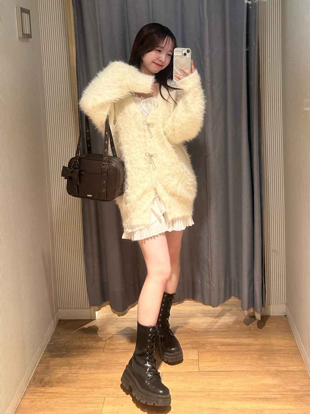 Yu.(Belle Charme渋谷109店)のショルダーバッグ「リボンチャーム付きスクエアボストン」を使ったコーディネート