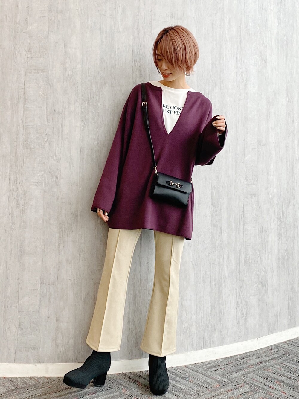 深いキーネックはレイヤードを楽しめて可愛い。 Instagram▷▶︎▷uemi_mw
