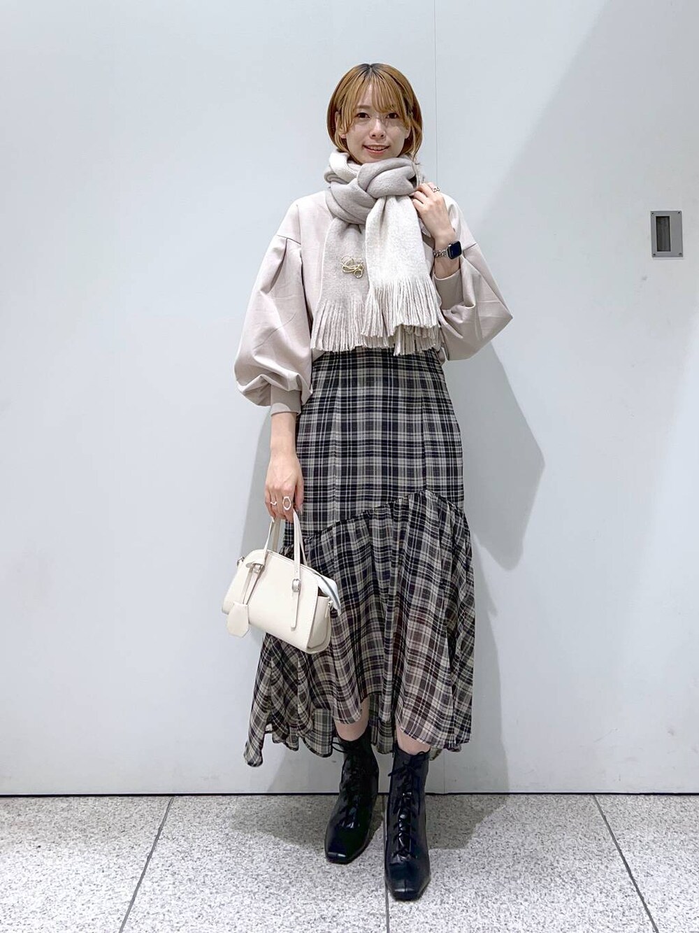 スワイプで別角度・動画も見れます* まだ冬アウターは着ない時期のマフラーコーデ。 ●トップス ボリューム袖が可愛いプルオーバー。 ハートネックになっているので、 デコルテラインも綺麗に見えます♡ 肌触りが柔らかく着心地も🙆♀️ ●スカート アシンメトリーな切り替えと 裾の切り替えが可愛いスカート。 裏地が短めで足元は透け感も出るので ショートブーツ合わせが可愛いです♡ ●ブーツ 普段23.5-24cmでLサイズを着用。 スクエアトゥですっきりした見え方になります。 ●マフラー バイカラーになっていて、 見せ方を工夫できる可愛いマフラーです♡ ふわふわの肌触りで、ボリュームは出過ぎないので 巻きやすいタイプです! ▼Instagramやってます▼ スタボには載せていない店頭新着情報やネイル画像、 リール動画もupしてます!