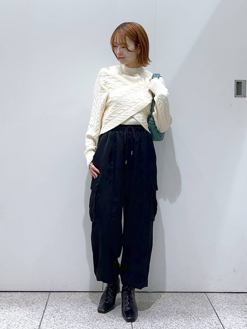 スワイプで別角度・動画も見れます* ●トップス カシュクールニットとタンクトップのアンサンブル。 お好みでオフショルにもできますが 肌見せなしでも着用できます。 生地は厚すぎず薄すぎずで柔らかい着心地◎ ●パンツ ウエストと裾が絞れるミリタリーパンツ。 サテン生地のツヤ感が上品に見せてくれます。 履き心地もとっても楽ちん! ●ブーツ 普段23.5-24cmでLサイズを着用。 スクエアトゥですっきりした見え方になります。 ●バッグ 結び目で持ち手の長さが変えられるバッグ。 内側にチャック付きのポケットもついてます。 ▼Instagramやってます▼ スタボには載せていない店頭新着情報やネイル画像、 リール動画もupしてます!