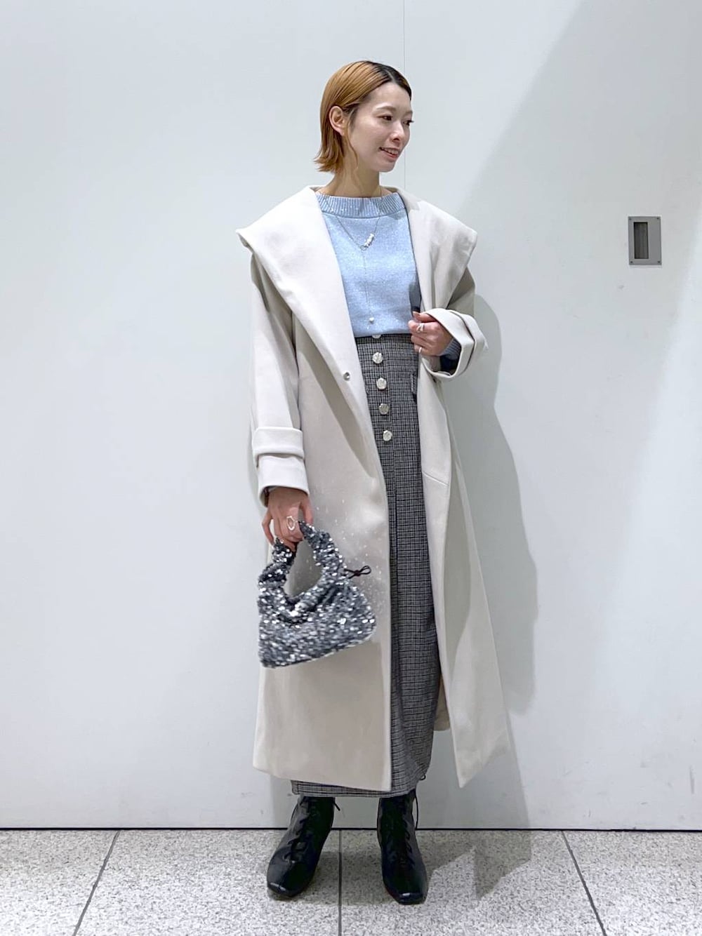 👕おすすめポイント  ̄ ̄ ̄ ̄ ̄ ̄ ̄ ̄ ̄ ̄ ̄ ̄ ̄ ̄ ̄ ̄ ̄ ホワイト×ブルー×グレーの色合わせで 大人っぽく綺麗めに見えるコーディネート。 ガウンコートは大きな襟で小顔に見せてくれます♡ 長さがあるのにとっても軽いのが人気です! 中に着たニットは新作のラメニット✨ モール糸なのでちくちくせず、毛玉もなりにくいです◎ スカートのボタンデザインがコーデを引き立ててくれます👏🏻 🎪こんなシーンで着てほしい  ̄ ̄ ̄ ̄ ̄ ̄ ̄ ̄ ̄ ̄ ̄ ̄ ̄ ̄ ̄ ̄ ̄ 年上彼氏とのデートに…🫶🏻 ▼Instagramやってます▼ スタボには載せていない店頭新着情報やネイル画像、 リール動画もupしてます!