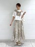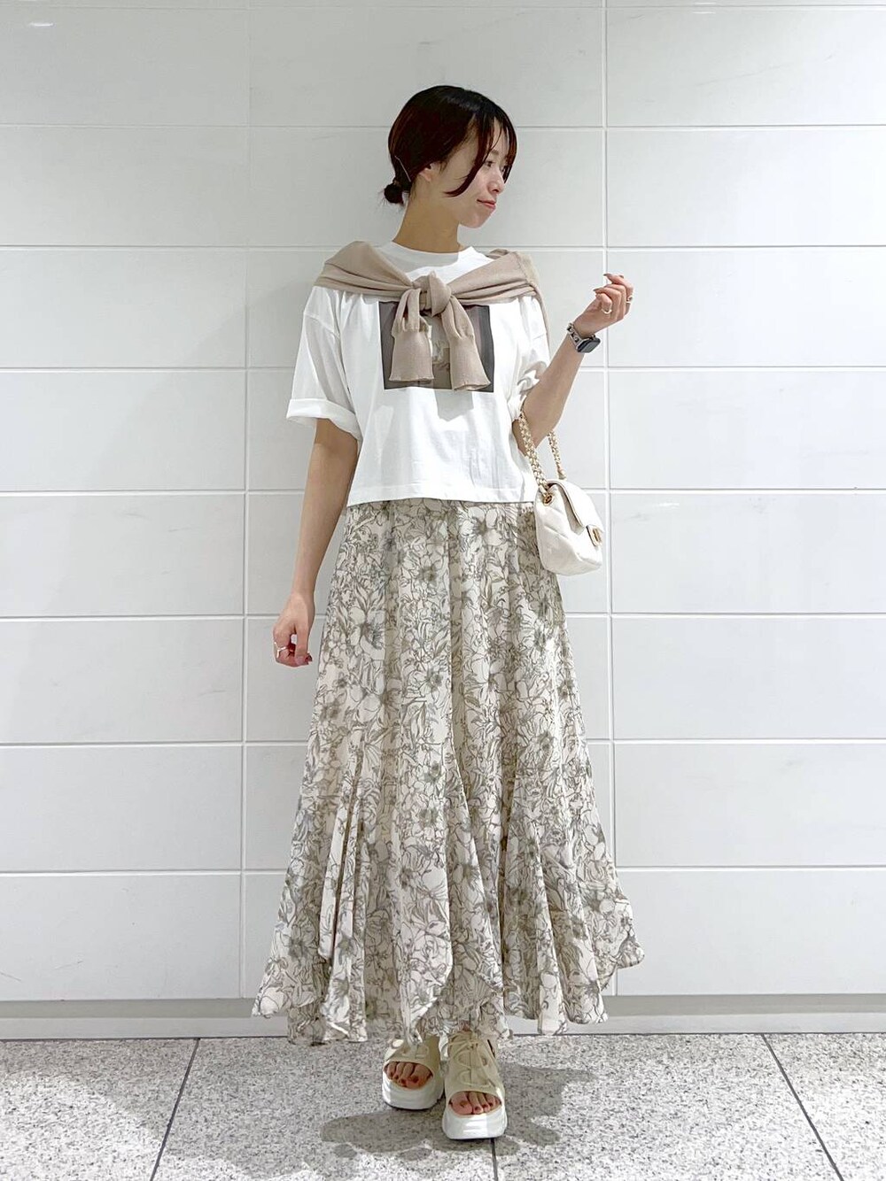 ▼使用アイテムは下からチェックできます▼ Instagramもやってます✌🏻 スタボには載せていない店頭新着情報やネイル画像、 リール動画もupしているので お出掛けの日も、ちょっとそこまでの日も 楽ちんでお洒落に見えるTシャツコーデ* 【Tシャツ】 ショート丈でインせずバランス良く着られます。 袖はゆるっとしているので 3回ロールアップして着てます🙋♀️ 綿100%なので安心して着れるのも嬉しいポイント🌟 【スカート】 マーメイドシルエットですが ぴたっとしない素材で着やすく美シルエットです。 歩くたびに揺れる裾が可愛いスカート😍 オールシーズン使える柄です!