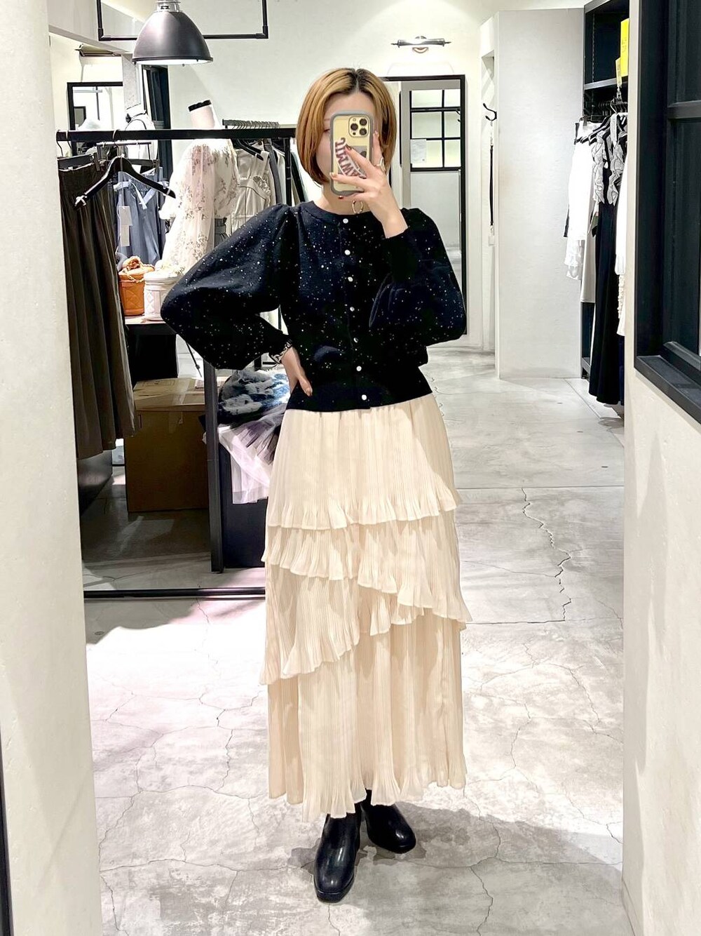 ▼使用アイテムは下からチェックできます▼ Instagramもやってます✌🏻 スタボには載せていない店頭新着情報やネイル画像、 リール動画もupしているので 【トップス】 キラキラのスパンコールが可愛いニット。 カーディガンとしても プルオーバーとしても着られる前後2way仕様! リブ袖でぽわんとする袖のシルエットが可愛い💓 身体が触れる内側のチクチク感も少なく 安心の着心地でご着用していただけます☺️ 【スカート】 アシンメトリーなデザインが おしゃれなプリーツスカート。 裏地がしっかり付いてるので 透けの心配は大丈夫でした! 光沢のある素材なのでニットとの相性抜群です✨