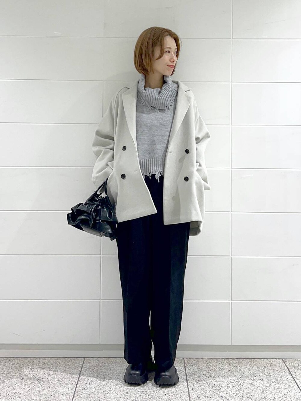 ▼使用アイテムは下からチェックできます▼ Instagramもやってます✌🏻 スタボには載せていない店頭新着情報やネイル画像、 リール動画もupしているので 【アウター】 ジャケットとコートの中間、「ジャコット」 ばさっと羽織りやすいオーバーサイズで とっても軽いことがポイント✨ ゆるシルエットになるので 中に着るお洋服はすっきりめがおすすめ! 【ニット】 ダメージ加工が可愛いショートニット。 タートルネックなのでしっかり温かい♡ インしなくて良いショート丈は コーディネートのバランスも整います🙆♀️ 【パンツ】 きれいなワイドストレートシルエットのパンツ。 ウエストは内側でサイズ調整ができるボタン付き! センタープレス入りなので着痩せ感も出ます✨