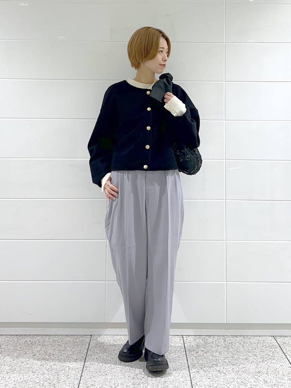 ▼使用アイテムは下からチェックできます▼ Instagramもやってます✌🏻 スタボには載せていない店頭新着情報やネイル画像、 リール動画もupしているので 【カーディガン】 ぽわんとしたシルエットが可愛いカーディガン。 金ボタンがポイントになります♪ 生地はしっかりめなのでアウター感覚で着られます! 【インナー】 袖がボタンデザインで シンプルながらも可愛いニット。 わざとお袖は長めに作られているので アウターやカーディガンからチラ見せさせるのも🫶🏻 首元と詰まりすぎてないので 窮屈感なくリラックスして着られます♪ 【パンツ】 きれいなワイドストレートシルエットのパンツ。 ウエストは内側でサイズ調整ができるボタン付き! センタープレス入りなので着痩せ感も出ます✨