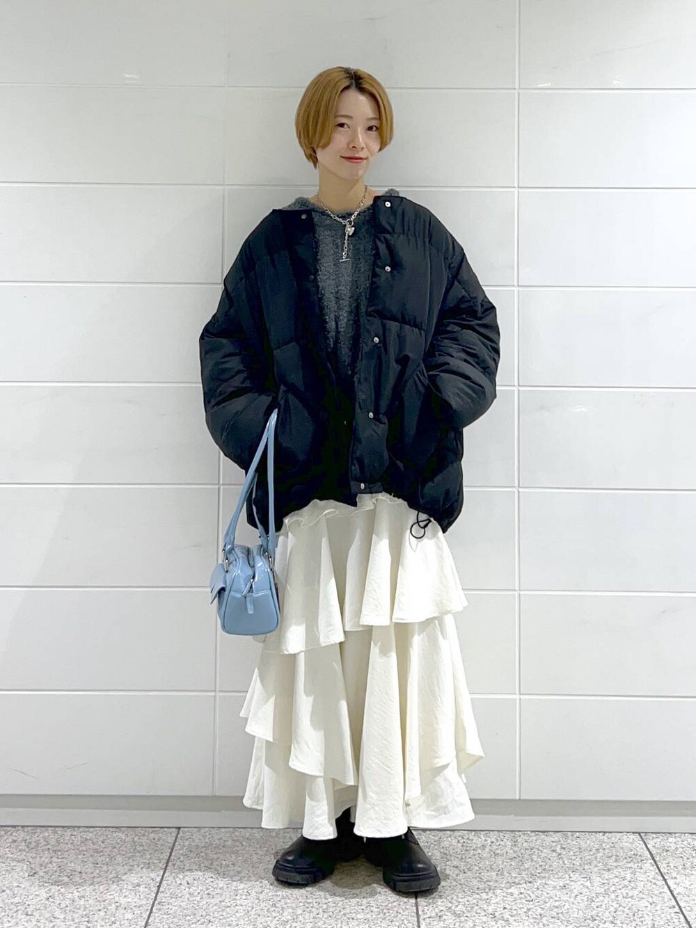 ▼使用アイテムは下からチェックできます▼ Instagramもやってます✌🏻 スタボには載せていない店頭新着情報やネイル画像、 リール動画もupしているので 【アウター】 マフラー付きで暖かい中綿ダウン。 首周りはノーカラーデザインですっきり着られます☺️ 裾を絞れるドロストデザインです! 【ニット】 とっても軽くて肌触りが柔らかいふわふわニット♪ モール素材なので毛玉になりにくいのも嬉しい! 大きめリブで体型を拾わず、 リラックスした着心地です🫶🏻 【スカート】 欠品していた人気のスカートも再入荷しました✨ とろんとした素材で揺れ感が可愛いティアードスカート。 腰回りがすっきり見えるのがお気に入り! ウエストはチャックなしのゴムタイプで 履き心地も履きやすさも満点です💯