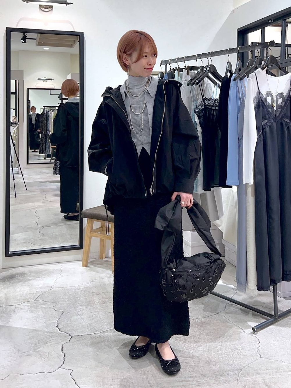 ▼使用アイテムは下からチェックできます▼ Instagramもやってます✌🏻 スタボには載せていない店頭新着情報やネイル画像、 リール動画もupしているので 【アウター】 とにかく軽さに感動する春のマウンテンパーカー🖤 首元は上まであげるとスタンドカラーになって 大人っぽく着られます! 腰回りが隠れるやや長めの着丈で ドロストコード付きなのでシルエットも変えられます🙆♀️ 【トップス】 キャミとニットポロのセットアイテム。 キャミは中に着ても、ポロの上に重ねても 着られるデザインで可愛い😍 コンパクトなシルエットなので コーディネートがすっきりまとまります! 【スカート】 ぽこぽこした表面が可愛いナロースカート。 伸縮性があるのでタイトシルエットでも 動きやすく歩きやすいです✨ ウエストゴムなのでたくさん食べる日も安心♪
