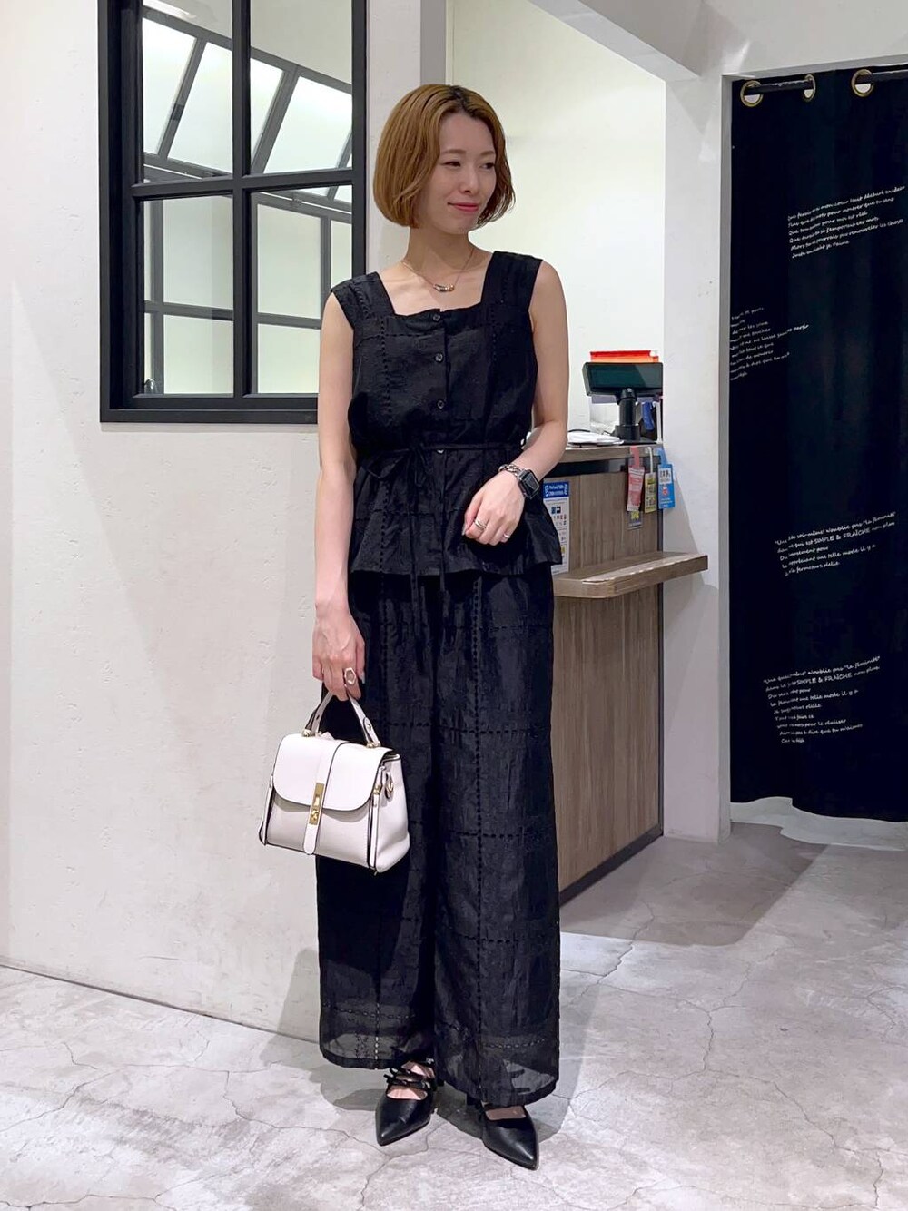 ▼使用アイテムは下からチェックできます▼ Instagramもやってます✌🏻 スタボには載せていない店頭新着情報やネイル画像、 リール動画もupしているので 【トップス】 パッチワークレースが大人可愛いブラウス🖤 毎年38℃近くまで上がる日本の夏に 涼しく着られるさらっとした素材のノースリーブ。 ウエストマーク付きなので ぎゅっと絞ってスタイルアップできます✨ 【パンツ】 ブラウスと同素材のストレートパンツ。 163cmで着丈ちょうど良かったです😊 ウエストはゴム仕様なので着心地も楽ちん♪ パンツの裾は裏地が短くなっていて 足元もすっきり見えるシアー感に♡