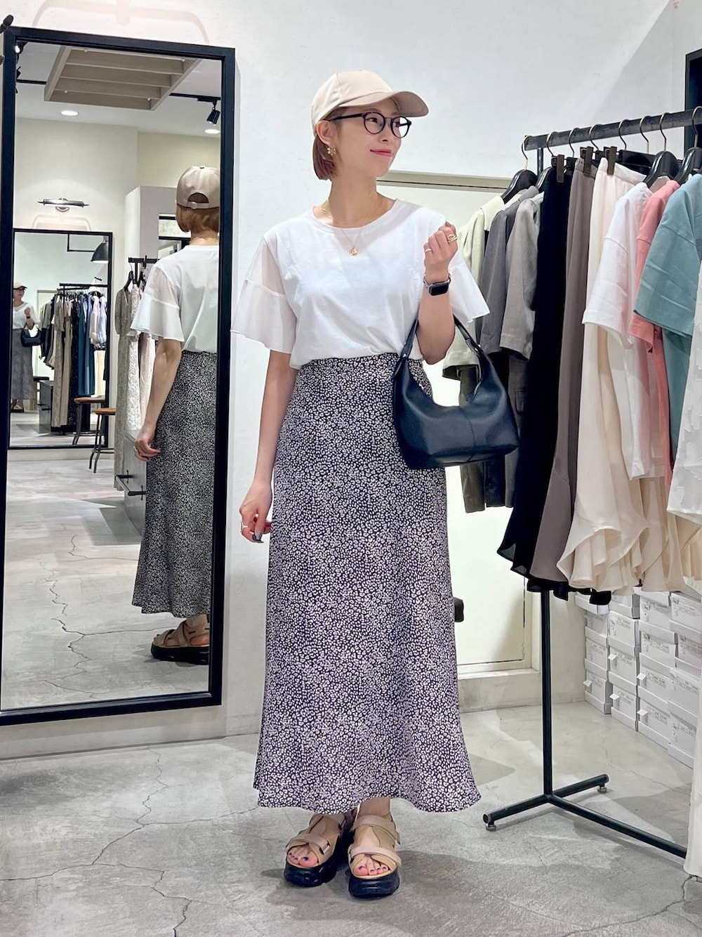 ▼使用アイテムは下からチェックできます▼ Instagramもやってます✌🏻 スタボには載せていない店頭新着情報やネイル画像、 リール動画もupしているので 【トップス】 今年も出ました👏🏻✨ シアー切り替えが大人かわいいTシャツ。 フレアスリーブで二の腕もカバーしてくれて シアー部分はちょうど脇にあたるので 汗染みを気にしなくていい神Tシャツ🥺 さらっとした素材で涼しく着られるアイテムです! 【スカート】 マットなサテン素材が大人っぽいスカート。 ボディラインを拾わずすっきり見える ナローシルエットで着痩せ感が出ます✨ 一見小花柄に見えるヒョウ柄が 夏コーデのアクセントになります🫶🏻