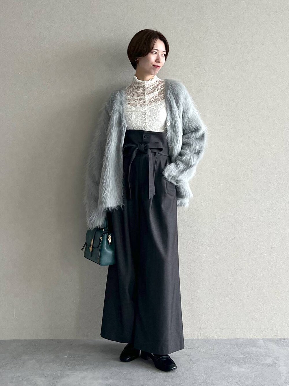 Swipe ▶︎動画やサイド・バックスタイルをご覧いただけます! 【カーディガン】 今年もトレンドのシャギーニットのカーディガン🧶 ふわふわでエアリーな毛足感が最大の魅力ですが 「接結編み」と言われる手法で密度がしっかりとある ニットの編み地でシルエットがとっても綺麗です✨ シャギーニットならではの着膨れ感が出ないのもお気に入り😍 【インナー】 ストレッチ総レースの華やかな印象のインナー。 フロントにギャザーデザインが入ってるので 見えてもいいキャミを中に着て1枚で着ても可愛いです♡ プチハイネックなので、カーデやニットに重ねて 首元や袖だけチラ見せもおすすめ👍🏻 【パンツ】 めーちゃくちゃ脚の長さが盛れるパンツ。 ボリュームはある方のワイドパンツで、 少し重たさも感じますが、 その分しっかりシルエットがキープされて 品のあるワイドシルエットです☺️  ̄ ̄ ̄ ̄ ̄ ̄ ̄ ̄ ̄ ̄ ̄ ̄ ̄ ̄ ̄ ̄ ̄ Instagram ▶︎ 私服やプライベートを載せています よかったらフォローしてください♡ DM,コメントでのお問い合わせも大歓迎です♡  ̄ ̄ ̄ ̄ ̄ ̄ ̄ ̄ ̄ ̄ ̄ ̄ ̄ ̄ ̄ ̄ ̄