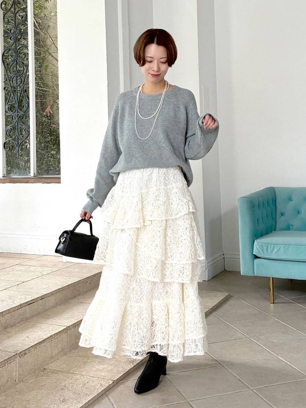Swipe ▶︎動画やサイド・バックスタイルをご覧いただけます! 【トップス】 毎年大人気のアイスクリームニット🍨 ちくちくしない柔らかいニットで たぽんとする袖のボリュームが可愛いアイテムです。 鮮やかすぎない発色のラムネカラーは 可愛くなりすぎないので大人も挑戦しやすいです🩵 【スカート】 1枚で主役級のデザインスカート✨ 起毛感のある素材でレースでも温かみのある表情です。 ボリュームがあるのですっきりめのアイテムと 合わせるのがおすすめ!  ̄ ̄ ̄ ̄ ̄ ̄ ̄ ̄ ̄ ̄ ̄ ̄ ̄ ̄ ̄ ̄ ̄ Instagram ▶︎ 私服やプライベートを載せています よかったらフォローしてください♡ DM,コメントでのお問い合わせも大歓迎です♡  ̄ ̄ ̄ ̄ ̄ ̄ ̄ ̄ ̄ ̄ ̄ ̄ ̄ ̄ ̄ ̄ ̄