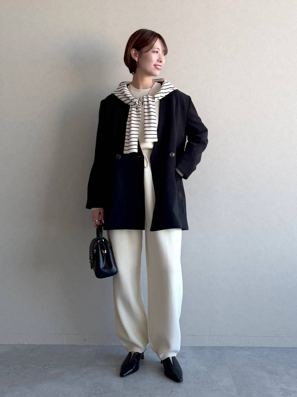 Swipe ▶︎動画やサイド・バックスタイルをご覧いただけます! 【ジャケット】 きれいめにもカジュアルにも使いやすい シンプルなノーカラージャケット。 肩パッド入りで立体的なシルエットが大人見えします。 さらっとしているツイル素材が女性らしい一着☺️ 【ニット】 スウェットのように楽ちんだけど きれいめに合わせやすいシンプルニット。 ラグランスリーブなので肩周りも華奢見え🫶🏻 コンパクトなサイズ感ながらもお袖はぽわっとするので バランスよく着やすいです! 今回はセットアップで着用✨ 全体の抜け感が出るように ボーダーのニットを肩掛けしました! 【パンツ】 スウェットのような感覚で履けるニットパンツ。 とにかく楽ちん!!!なのに綺麗め見えする優秀パンツ! ボディラインを拾わないシルエットでゆるっと履けます😊  ̄ ̄ ̄ ̄ ̄ ̄ ̄ ̄ ̄ ̄ ̄ ̄ ̄ ̄ ̄ ̄ ̄ Instagram ▶︎ 私服やプライベートを載せています よかったらフォローしてください♡ DM,コメントでのお問い合わせも大歓迎です♡  ̄ ̄ ̄ ̄ ̄ ̄ ̄ ̄ ̄ ̄ ̄ ̄ ̄ ̄ ̄ ̄ ̄