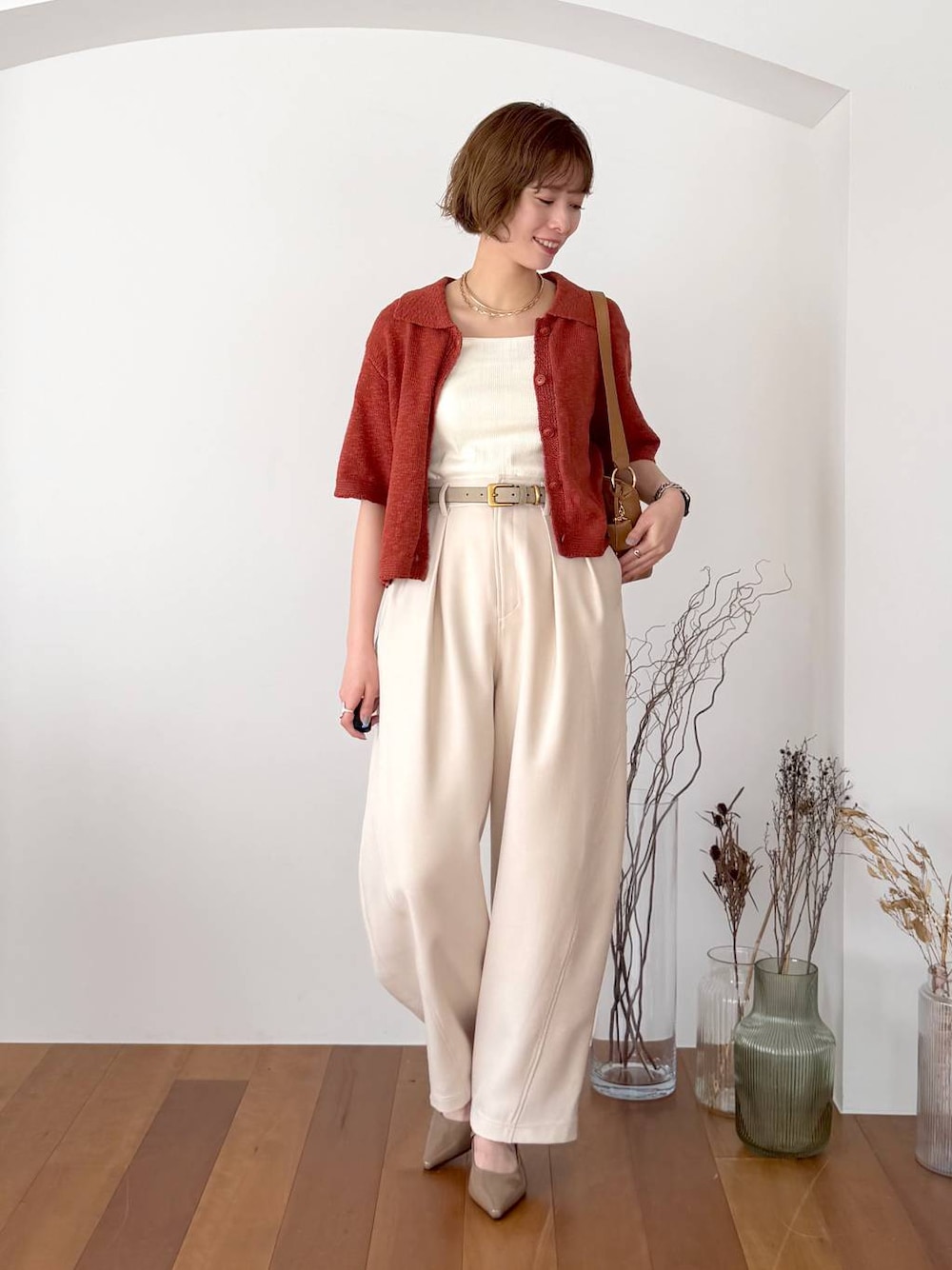 Swipe ▶︎動画やサイド・バックスタイルをご覧いただけます! 【カーデ】 生地の表面感が可愛い5部袖カーディガン。 ハンパ袖が苦手と言われてる骨格ナチュラルの私でも これはバランスよく着られました✨ 自然と抜け感が出るゆるっとシルエットと ポロ襟になってるのですっきり感も🙆♀️ 薄手で柔らかくて着心地もいいです☺️ 【インナー】 前後2wayで使えるシンプルなタンクトップ。 下着も透けずブラウスやシャツのインナーとしても テレコ素材なので見せるインナーとしても 使い勝手のいい1枚です🫶🏻 【パンツ】 履いて感動!!本当にこういうの欲しかった🥺 さらっとしたきれいめなツイル素材で カジュアルになりすぎず 体型カバーもできるカーブパンツ✨ 楽ちん過ぎて毎日履きたい😂💞  ̄ ̄ ̄ ̄ ̄ ̄ ̄ ̄ ̄ ̄ ̄ ̄ ̄ ̄ ̄ ̄ ̄ Instagram ▶︎ 私服やプライベートを載せています よかったらフォローしてください♡ DM,コメントでのお問い合わせも大歓迎です♡  ̄ ̄ ̄ ̄ ̄ ̄ ̄ ̄ ̄ ̄ ̄ ̄ ̄ ̄ ̄ ̄ ̄