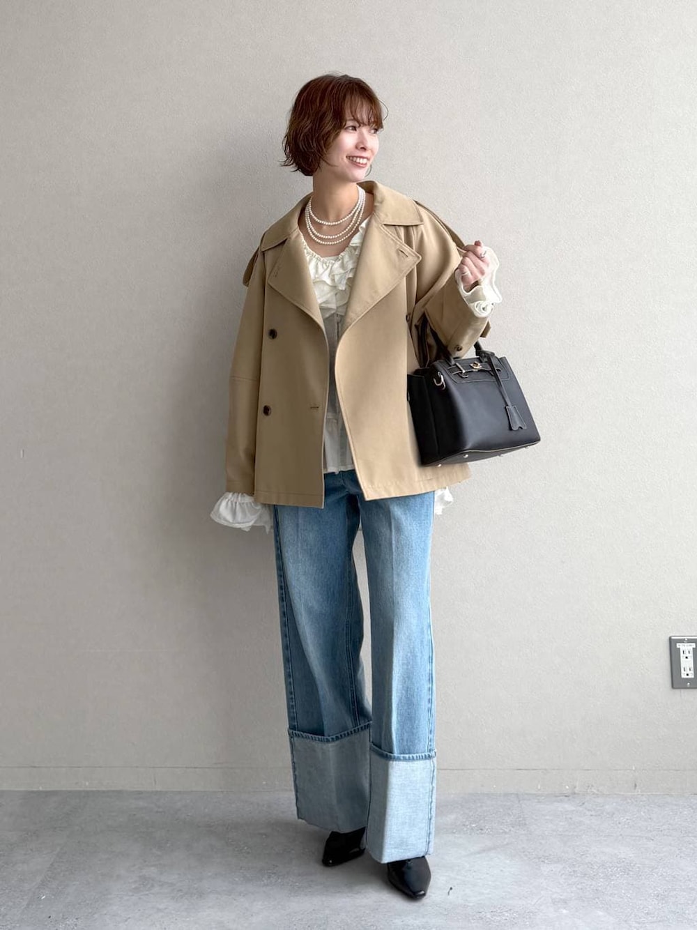 Swipe ▶︎動画やサイド・バックスタイルをご覧いただけます! 【アウター】 周りと差をつけたい人におすすめのショートトレンチ! ハリ感のあるコットンツイル素材で立体的なフォルムに。 肩章がコーディネートのポイントになります☺️ (取り外しも可能です!) ウエストベルトは長めなので ぎゅっと絞ってメリハリをつけて着るのがおすすめ🙆♀️ 【ブラウス】 たっぷりフリルの可愛いブラウス🫶🏻 ボリュームがあるのでパンツなどの すっきりしたボトムス合わせがおすすめです! 袖口がゴムになってて袖を少し捲った着こなしも 大人可愛く着られます😘 【パンツ】 163cmでMサイズを着用。 太めのロールアップがポイントになって可愛い😍 シルエットもズドンとしたワイドシルエットで 大人っぽく履けるパンツです!  ̄ ̄ ̄ ̄ ̄ ̄ ̄ ̄ ̄ ̄ ̄ ̄ ̄ ̄ ̄ ̄ ̄ Instagram ▶︎ 私服やプライベートを載せています よかったらフォローしてください♡ DM,コメントでのお問い合わせも大歓迎です♡  ̄ ̄ ̄ ̄ ̄ ̄ ̄ ̄ ̄ ̄ ̄ ̄ ̄ ̄ ̄ ̄ ̄