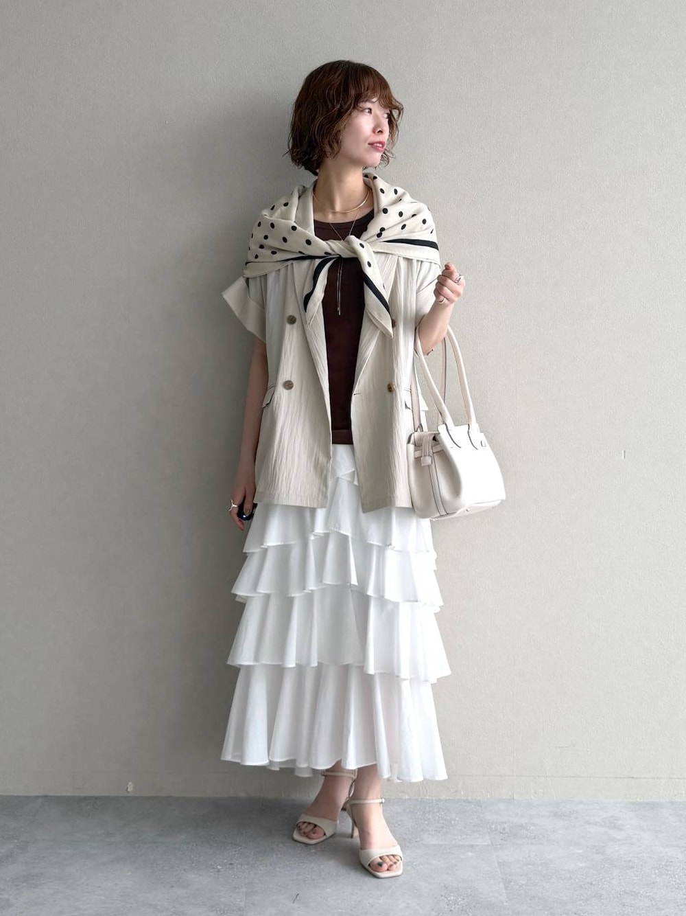 Swipe ▶︎動画やサイド・バックスタイルをご覧いただけます! 【ジャケット】 接触冷感とイージーケアの機能付きジャケット。 さらっとした薄手素材で涼しく着られて、 シワになりにくいので旅行にもおすすめです🫶🏻 オーバーサイズですが柔らかい生地なので 羽織るだけで自然と抜け感が出て着膨れもなし✨ 【インナー】 バッグオープンで女っぽコーデが完成するシンプルT。 ボディに沿うコンパクトなシルエットで すっきり着痩せ感が出ます✨ 【スカート】 秋に人気だったフリルスカートが春夏バージョンで登場! 細かめのフリルティアードが主役級デザイン♡ 足元は前がやや短めなのでサンダルコーデも映えます👡 腰回りがすっきり見えると大人気❣️  ̄ ̄ ̄ ̄ ̄ ̄ ̄ ̄ ̄ ̄ ̄ ̄ ̄ ̄ ̄ ̄ ̄ Instagram ▶︎ 私服やプライベートを載せています よかったらフォローしてください♡ DM,コメントでのお問い合わせも大歓迎です♡  ̄ ̄ ̄ ̄ ̄ ̄ ̄ ̄ ̄ ̄ ̄ ̄ ̄ ̄ ̄ ̄ ̄
