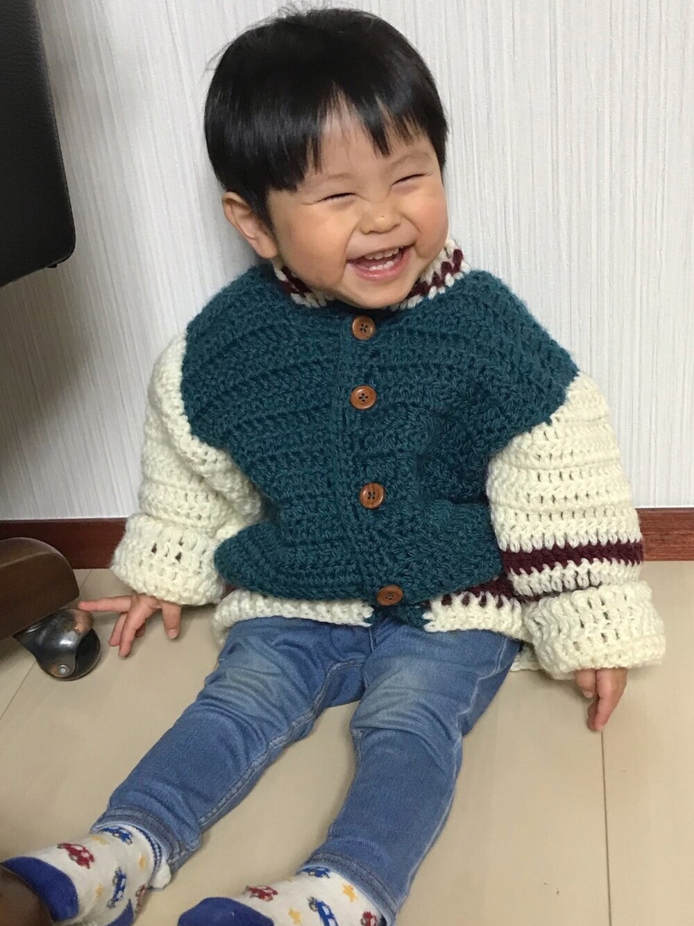 1歳8カ月になりました♡ 毎日ニコニコ笑顔♡ ニットは母の手作り〜 手編みのニットって温かいんですよね^_^ ズボンは無印👖です。 本当に履かせやすくて90サイズもリピートしました。おススメです!!