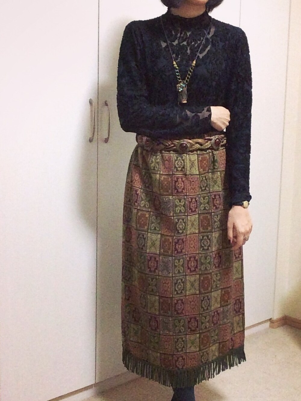 スカートの後ろには、大胆なスリットが入っています。 ネックレスとタイツ、靴以外は古いもの。