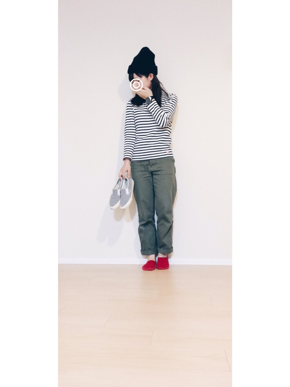 普段着。近所スタイル。 何もしてない髪を隠すためのニット帽。 しましまにはスント◎ 赤い靴下目立つ。