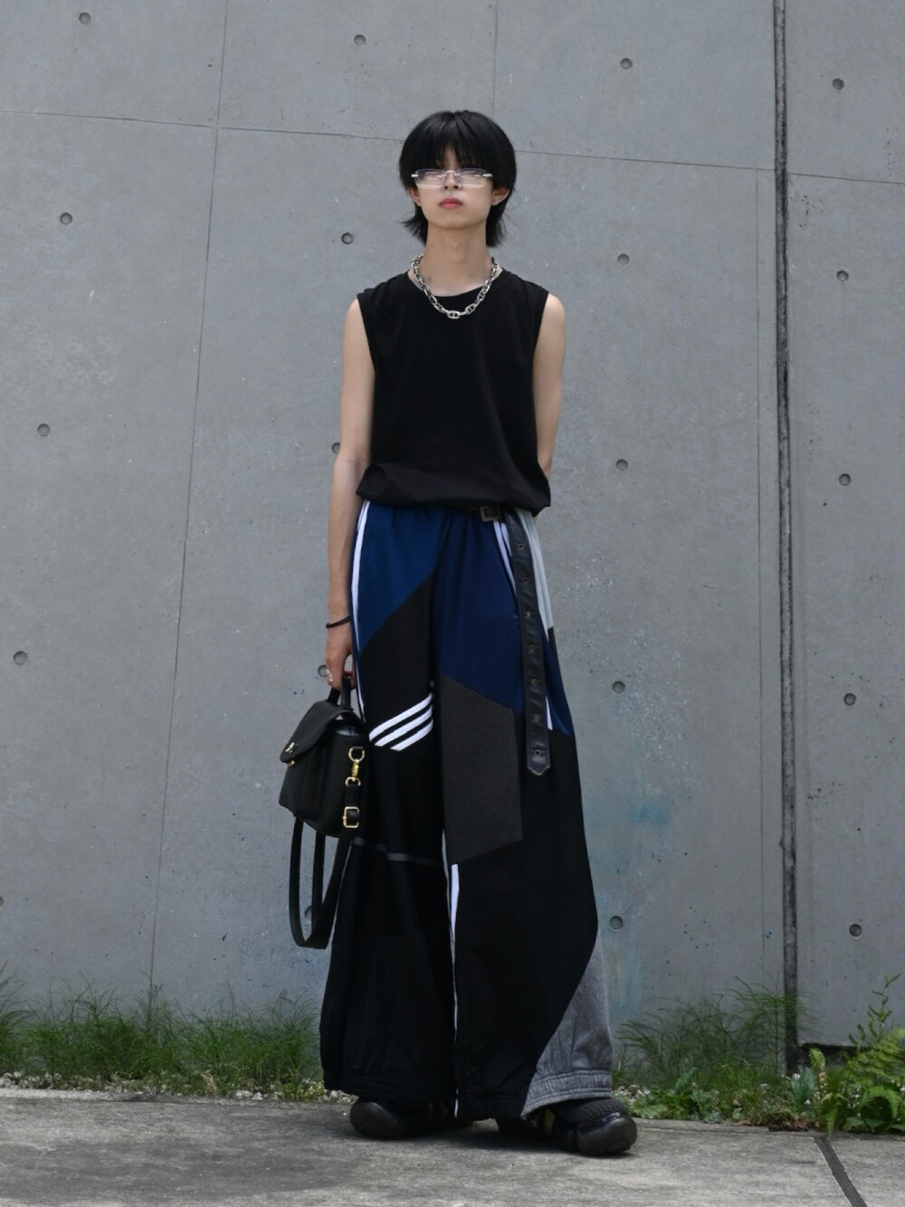 Instagram:@u_my_na いつも閲覧頂きありがとうございます。 いいね、フォロー、お気に入りもお待ちしております。 ノースリーブTにリメイクトラックパンツとリムレスを合わせたテクノモードコーデです。