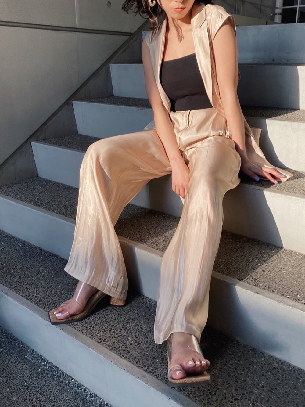 綺麗目な光沢感のあるシアー素材のセットアップ!ノースリーブのジャケットにはベルトもついてるので締めてきても可愛いんです!セットアップだけど別々でも使えるので着回し力も抜群◎