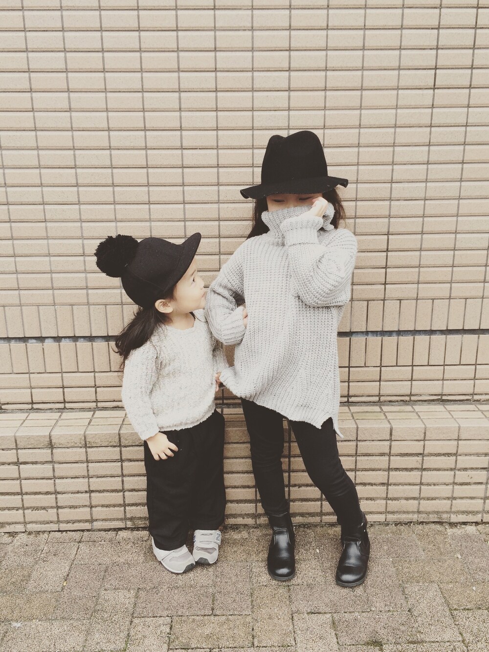 ニットで揃えてみた2人、、、母もニットに黒パンツでみんなおそろいw 今日は寒いー ストールぐるぐる