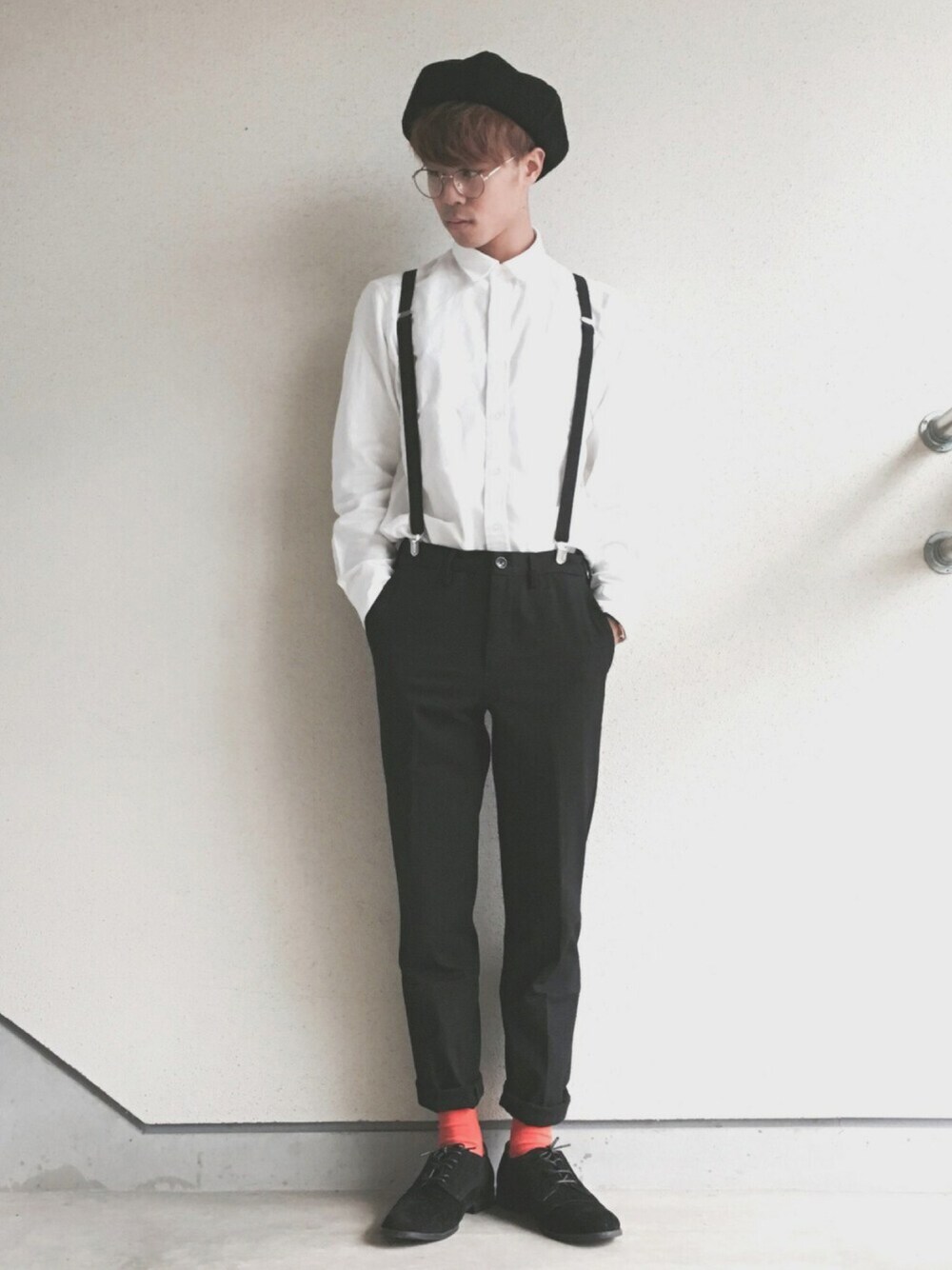 今日は暖かかったのでアウターなしで! サスペンダー使ってのコーデ足長効果あっていいです! ベレー帽もっとかぶっていかないと