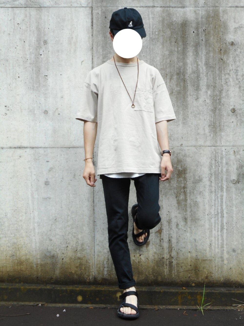「Tシャツ(ベージュ)×スキニー(ブラック)」 去年購入したベージュのビッグTを使ったコーデです。 無難に黒スキニーと合わせました。 【コーデのポイント】 1.ビッグTとスキニーを合わせてYラインシルエットをつくりました。 【サイズ】 Tシャツ:S タンクトップ:S パンツ:27inch サンダル:25cm