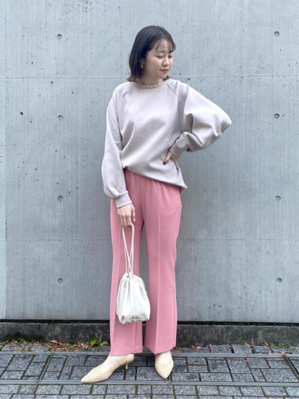 ピンクで春カラーリラックススタイル。 スウェット:普段サイズM,36/着用サイズF ゆったりとしたサイズ感です。裾が長めでヒップの隠れる丈感です◎シワにならない素材感なので御選択の後も心配いりません!ストレッチ性があって着やすいです♪タイトスカートと合わせても素敵です♪ パンツ:普段サイズ36/着用サイズF 私の体型で程よくゆとりがあり、脚のラインをひきませんでした◎裾が少し長めなのでヒールと合わせるとスッキリ着れます!またストレッチが効いていて凄く動きやすい楽チンアイテムです。