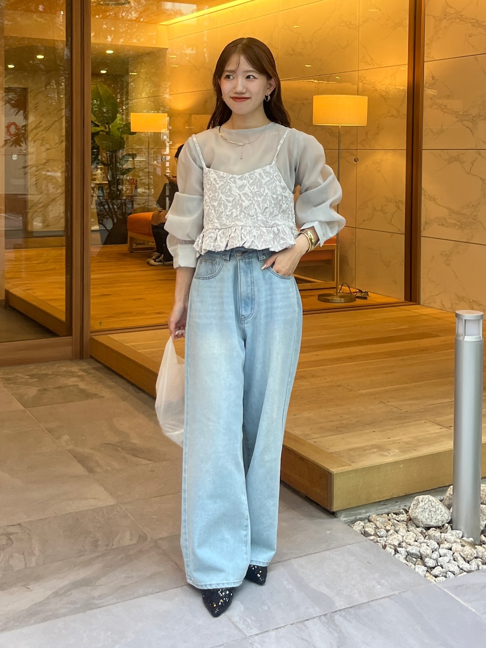 yuna(Thevon.)のシャツ/ブラウス「ジャガードビスチェ×シアーブラウス」を使ったコーディネート
