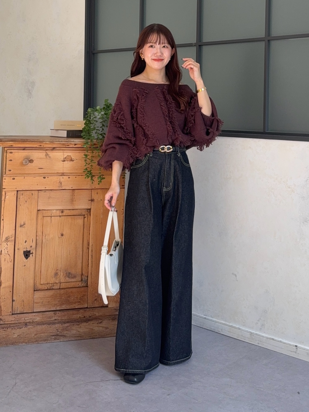 yuna(Thevon.)のニット/セーター「ウェーブフリンジショートニット」を使ったコーディネート