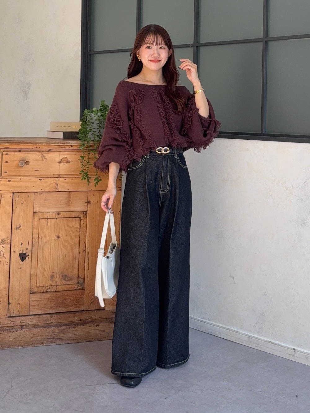 yuna(Thevon.)のニット/セーター「ウェーブフリンジショートニット」を使ったコーディネート