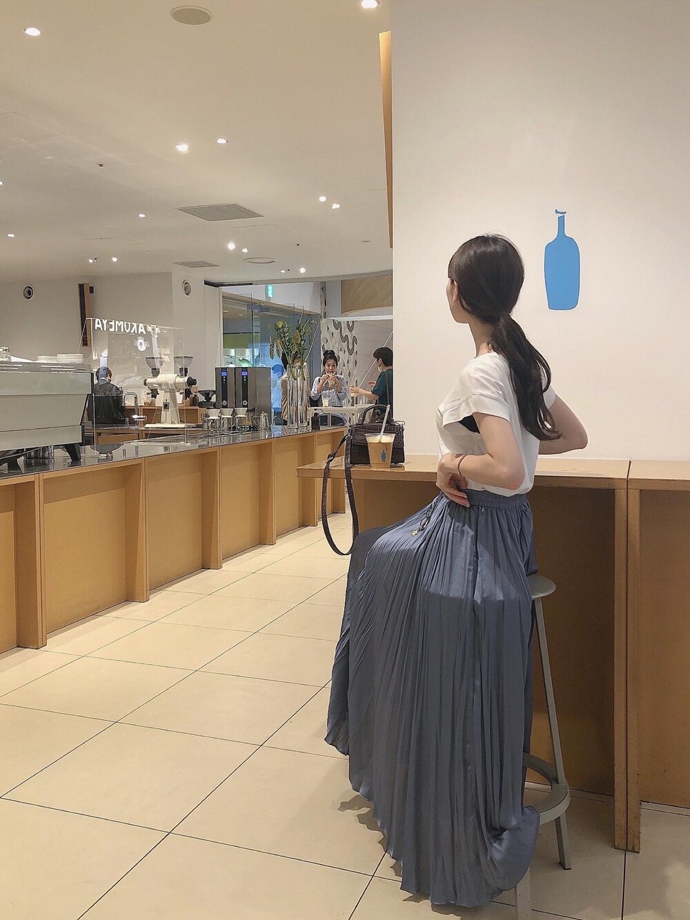ブルー系のスカートを着用したレディースの夏コーディネートの1枚目の写真