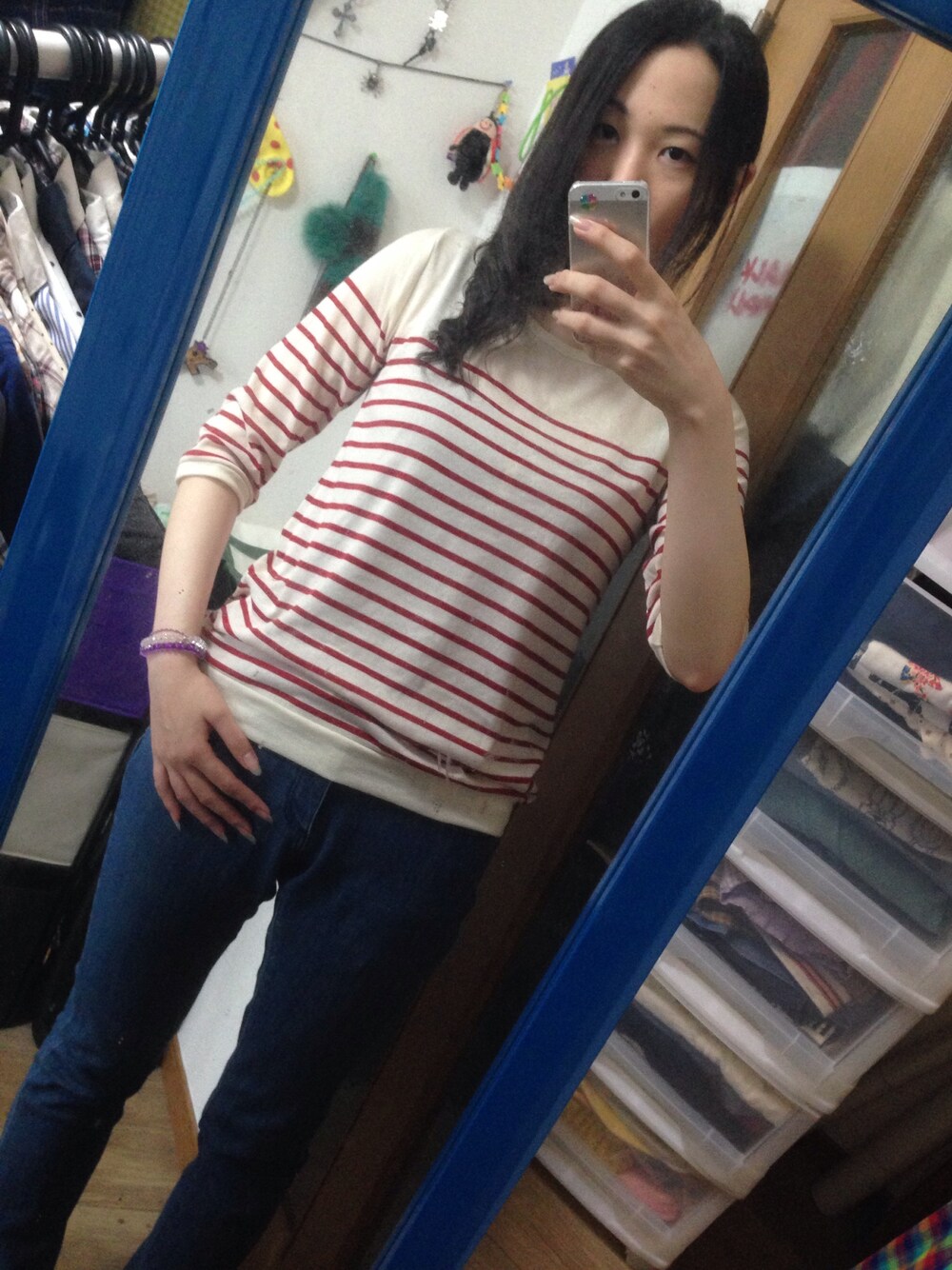 今日は珍しく髪を束ねて出勤。 トップスは今年初めて着たよ! ボーダー似合う…? ジーパンは暑い!!