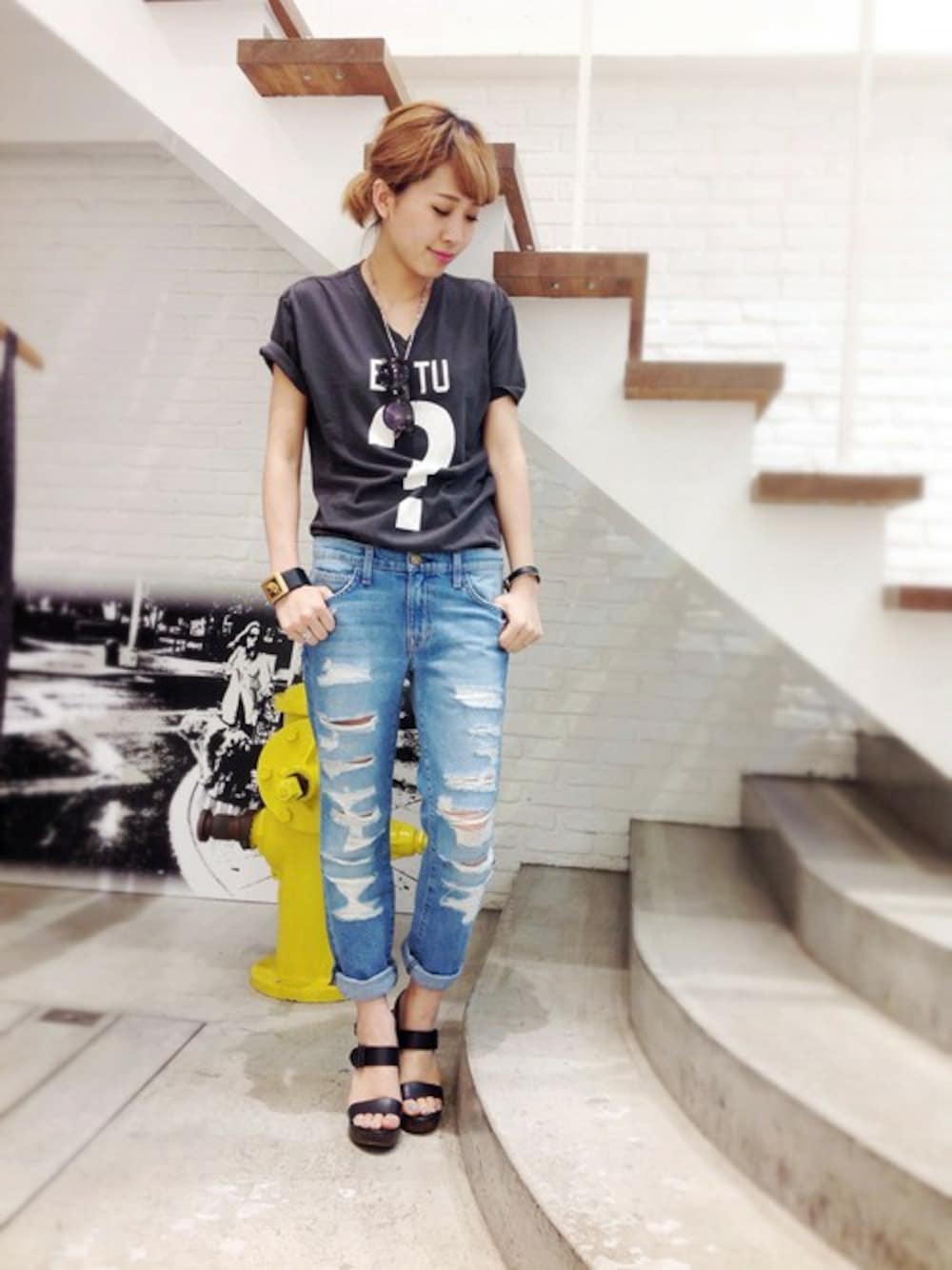 CURRENT ELLIOTT(カレントエリオット)の新作デニムはクラッシュ加工がおしゃれっ✳︎‼︎ さらっとTシャツで合わせて、足元はカジュアルになりすぎない様にFRYE(フライ)のヒールサンダルでバランスを♥︎